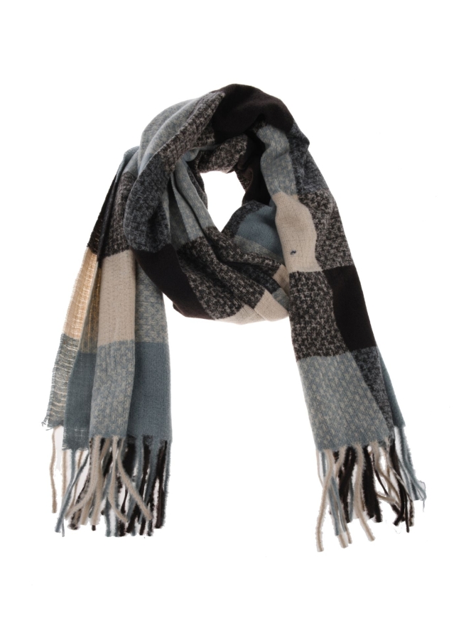Geruite sjaal in blauw en bruintinten met een afmeting van 65 x 180 cm.