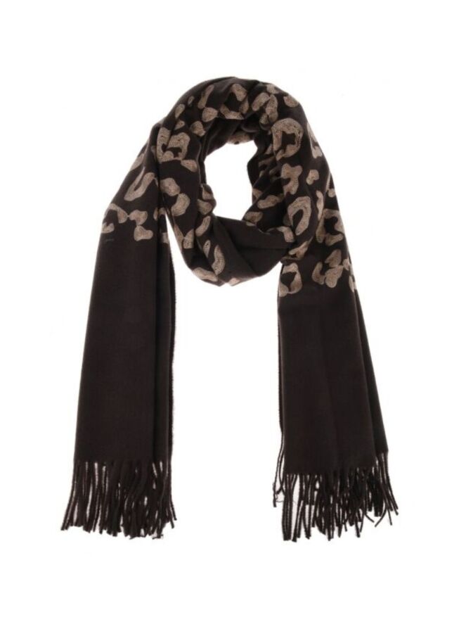 Deze sjaal is effen met opgeborduurde panterprint. Afmeting 67 x 180 cm.