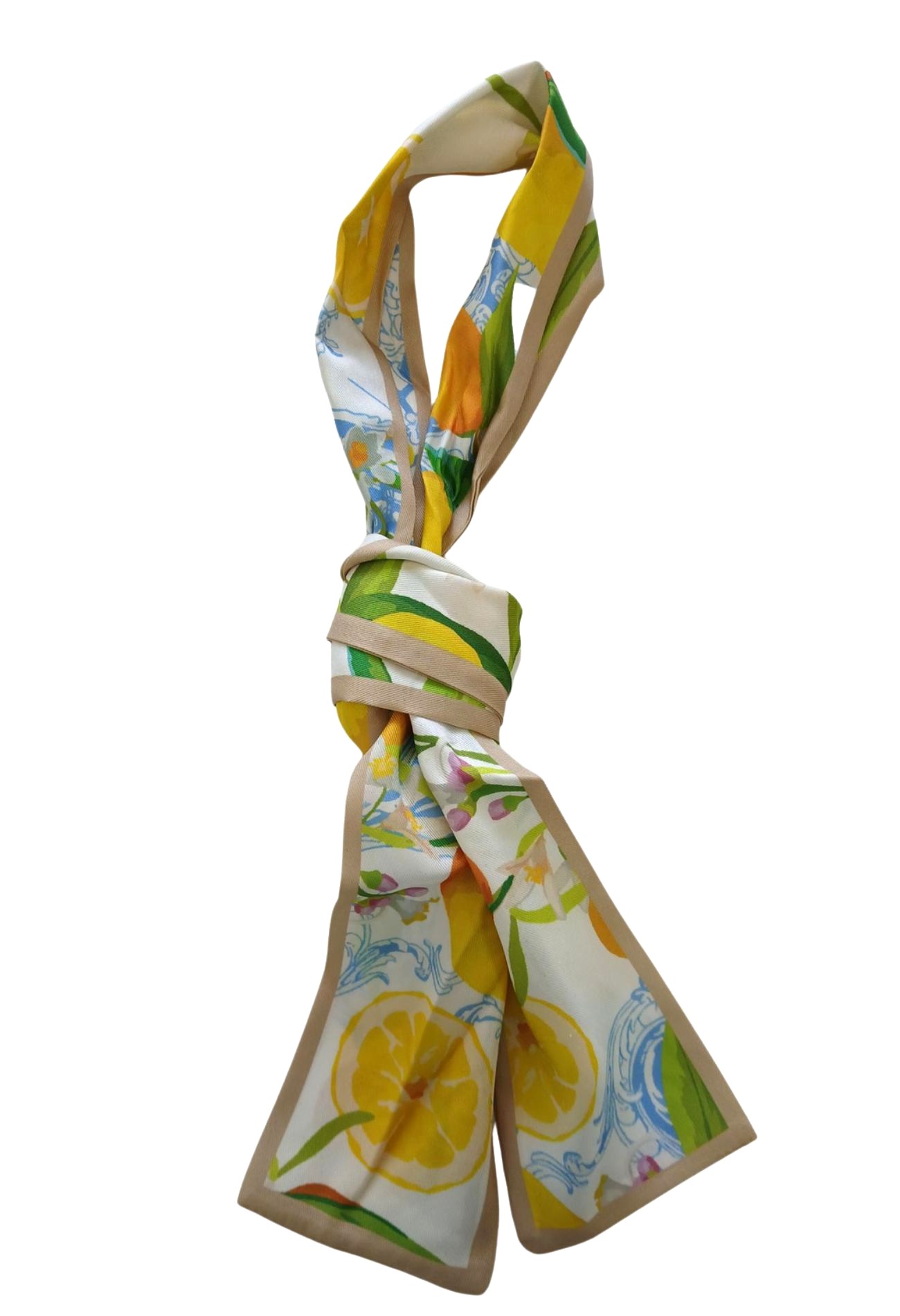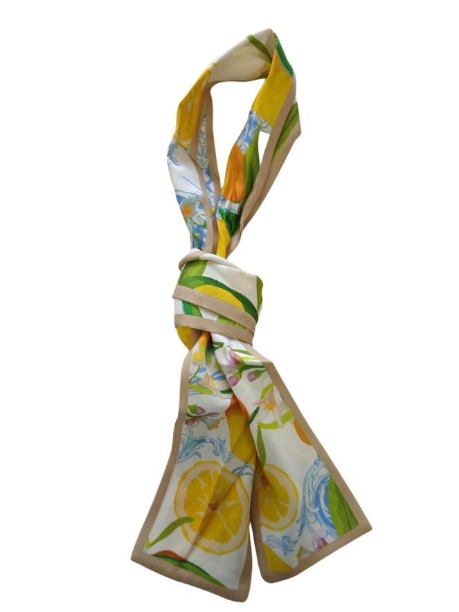 Trendy smal sjaaltje met een frisse citroen print. Een vrolijke eyecatcher die meteen een zomerse vibe aan je outfit geeft. Dit veelzijdige sjaaltje draag je om je nek, in je haar, aan je tas of door de lussen van je jeans als riem. Perfect om eindeloos te variëren en je look net dat beetje extra te geven. Afmeting 8 x 120 cm.