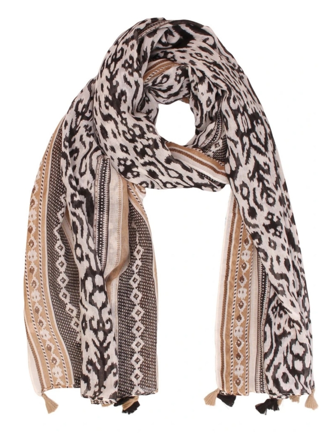 Zomerse dunne sjaal met een Ikat print en kwastjes aan de uiteinden. Afmeting 88 x 180 cm.