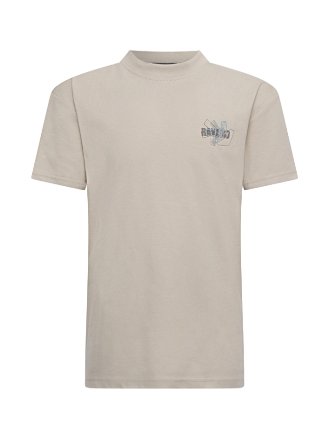 Fijn T-shirt met een opstaande hals die net wat warmer afkleed dan een zomers shirt! Dit shirt heeft een grote print op de rug en een kleintje voorop. Draagt leuk onder een shacket of overshirt.