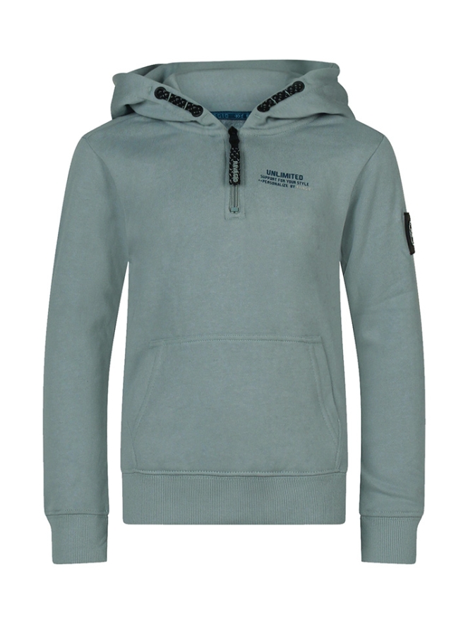 Neutrale hoodysweater met een klein ritsje en een badge op de mouw.