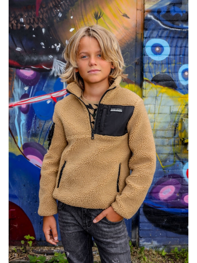 Teddy trui van Ravagio. De trui is van teddy stof en heeft een rits bij de hals. De trui heeft een borst zakje en een mouw zakje van andere stof. De trui heeft twee zakken op de voorkant. Materiaal: 100% polyester. Wassen op 30 graden, niet bleken, niet in de droger, kan gestreken worden.