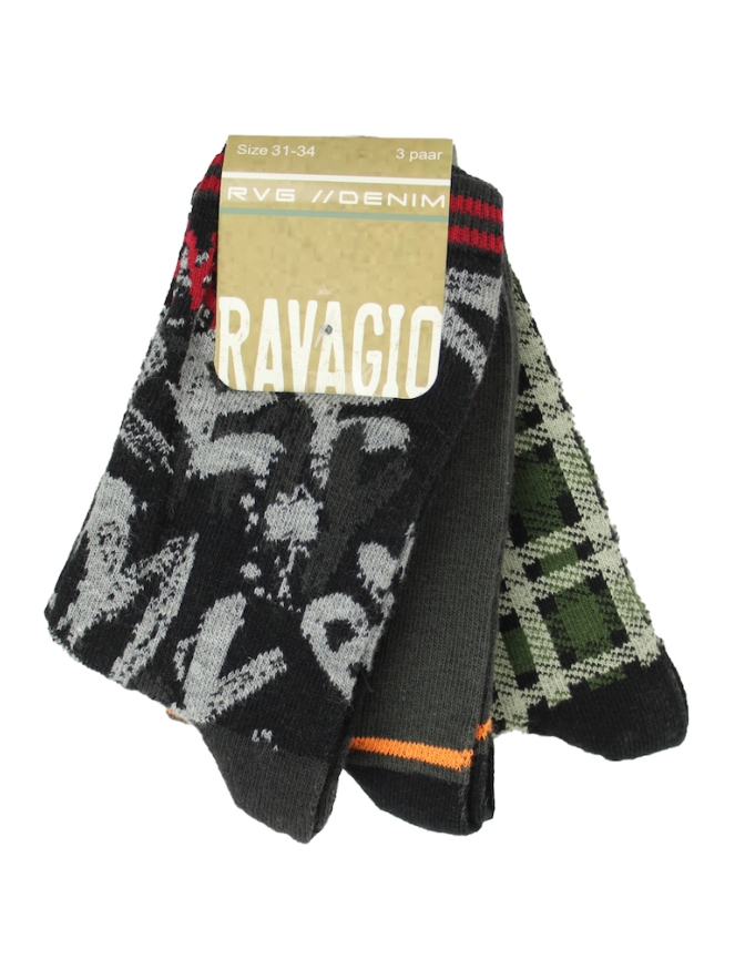 3 paar sokken van Ravagio. 1 paar sokken heeft een graffiti print, 1 paar met strepen en logo, 1 paar met ruit print. Materiaal: 75% katoen, 22% polyester, 3% elasthan. Wassen op 30 grade, niet bleken, niet in de droger.