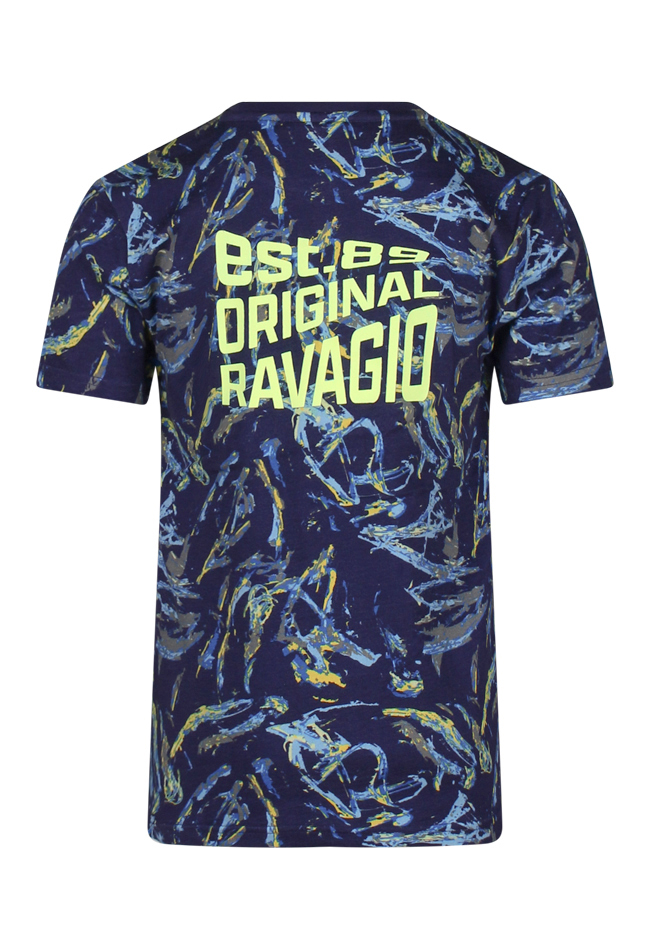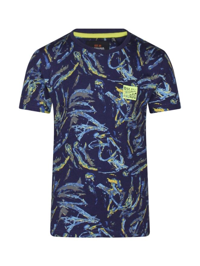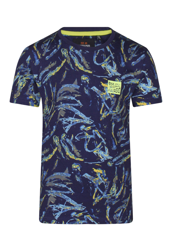 Multicolor T-shirt met allover print en achterop een grote tekstprint. Leuk op een effen kortebroek, jeans of sweat jogging. Maar we hebben ook een korte broek met precies dezelfde print. Deze vind je onder art.nr. Z90283