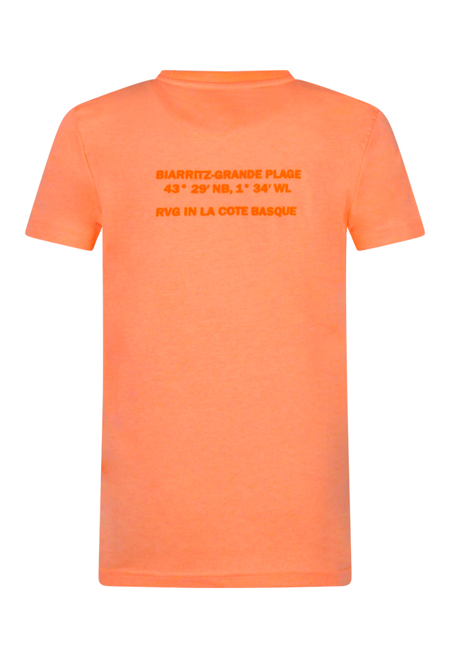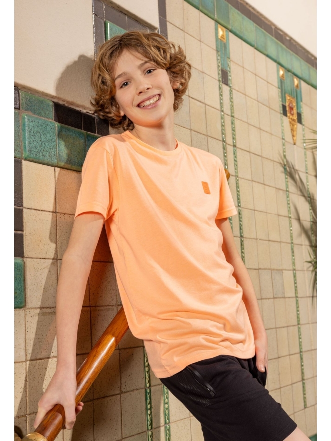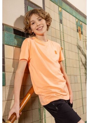 Fris gekleurd T-shirt met voorop een kleine badge en achterop een tekstprint. Makkelijk te combineren voor een sporty casual look met lange en korte broeken, ook leuk op je zwembroek!