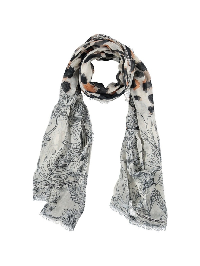 Sjaal van Sarlini. Deze sjaal heeft een panter blader print en een afmeting van 100x200 cm. Deze sjaal is gemaakt van 100% polyester.