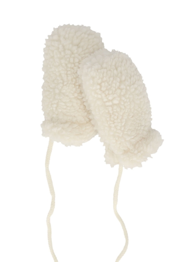 Fluffy wanten van teddy stof met een koordje om ze bij elkaar te houden.