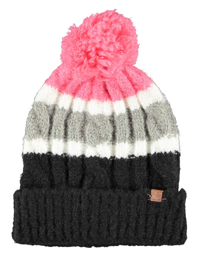 Deze muts heeft een gestreept patroon en een pompom op de bovenkant.
