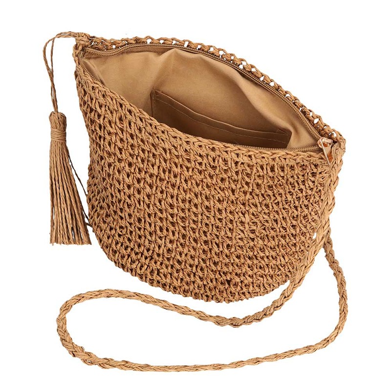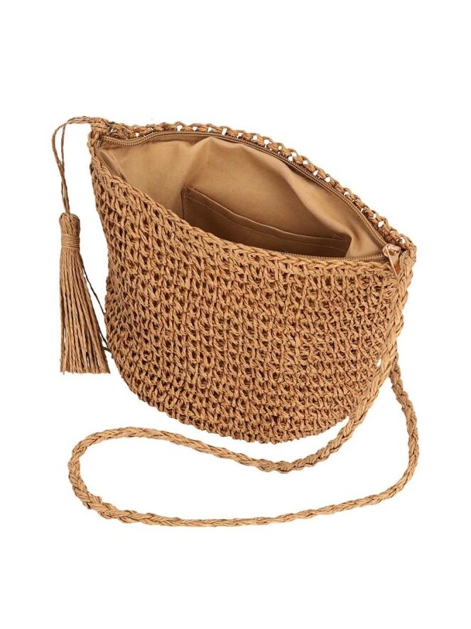 Kleine gevlochten heuptas van Sarlini. Deze tas kan gesloten worden met rits en heeft een schouderband.