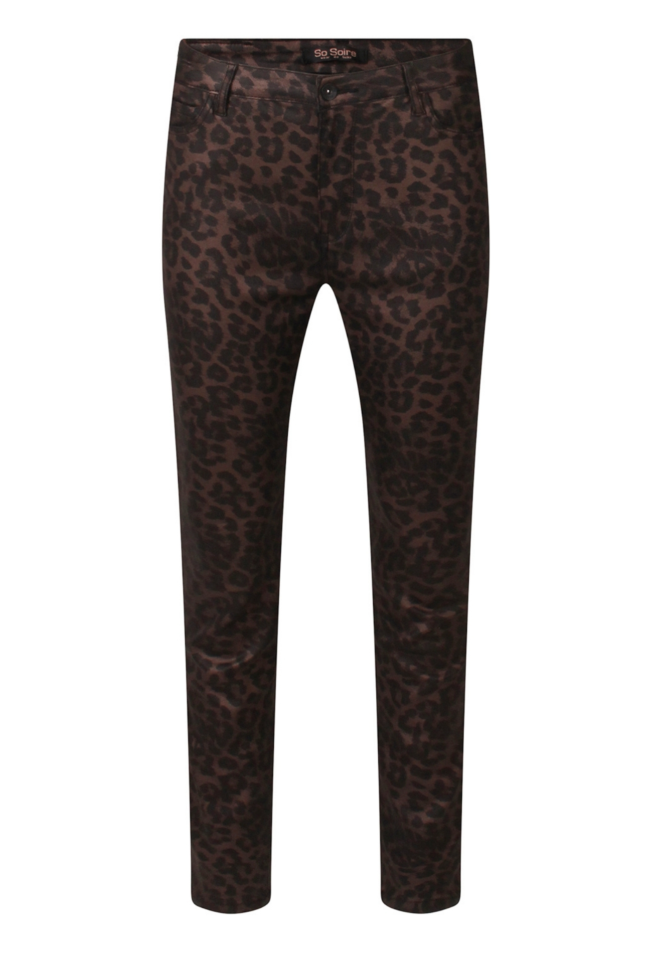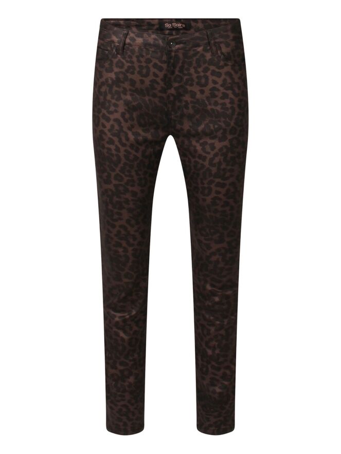 Deze coated broek met panterdessin is een echte statement piece! Het 5-pocket model zit als gegoten en de smalle pijpen zorgen voor een vrouwelijke, aansluitende fit. Dankzij de subtiele glans van de coating krijgt je outfit een stoere en chique touch. Perfect met een basic top en boots voor een edgy everyday look!