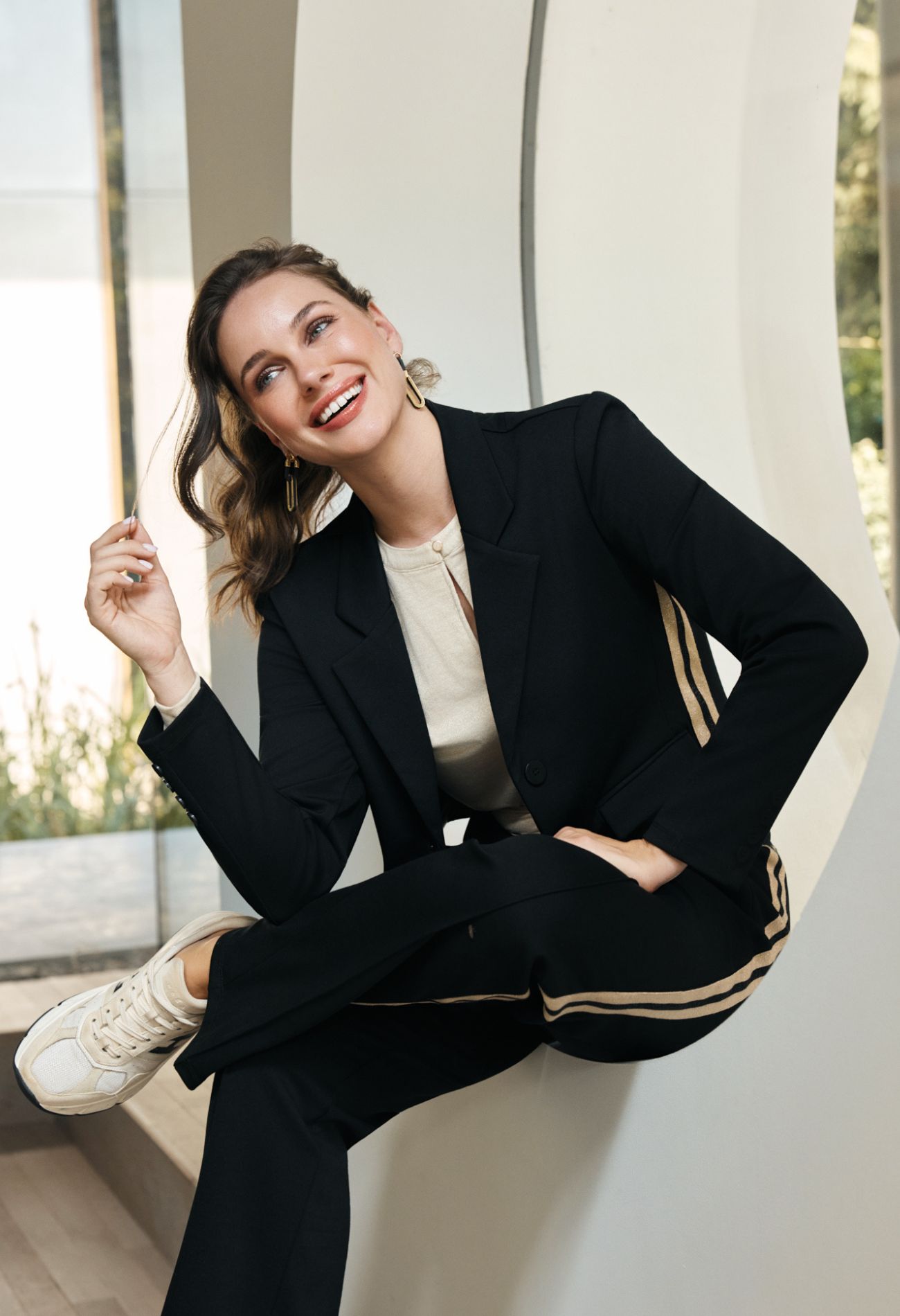 Prachtige pantalon met een opnaad voor over het been, fijne steekzakken en een mooi streeppatroon over de zijkant van de broek. Dit geeft de broek een sportieve uitstraling! Hou je van een leuk pak? We hebben een bijpassende blazer met dezelfde streep verkrijgbaar onder art.nr. W10373.