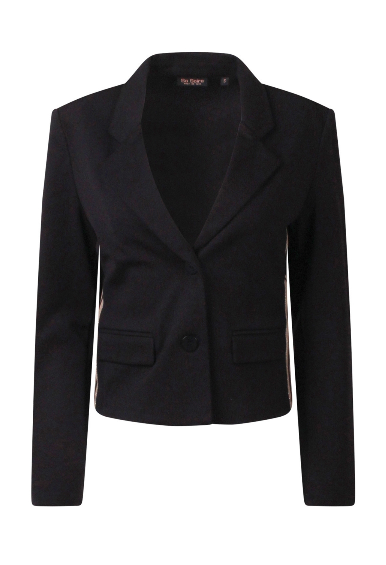 Leuke blazer met klepzakken en een mooi streepdetail in de zij. Deze blazer is een kort modelletje en niet getailleerd. Hou je van matchy pakken? Een bijpassende broek met hetzelfde streepdetail vind je onder art.nr. W10372. Stoer sportief pak!