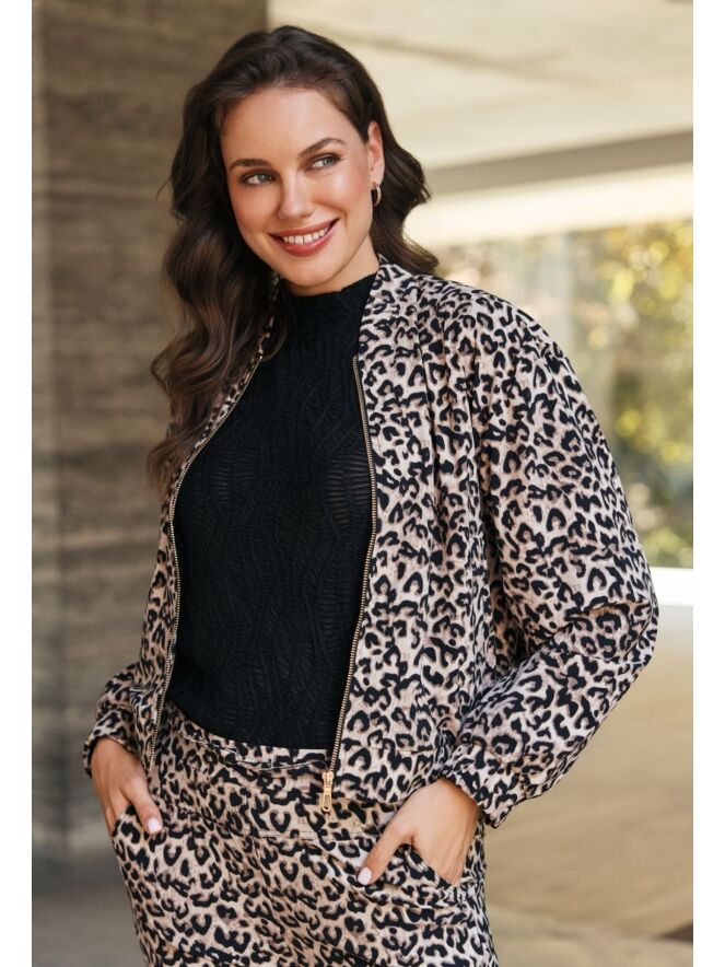 Dit jack van travel stof heeft een opvallend panterdesign. Met fijne steekzakken en een goudkleurige rits is dit een eyecatcher op en top!