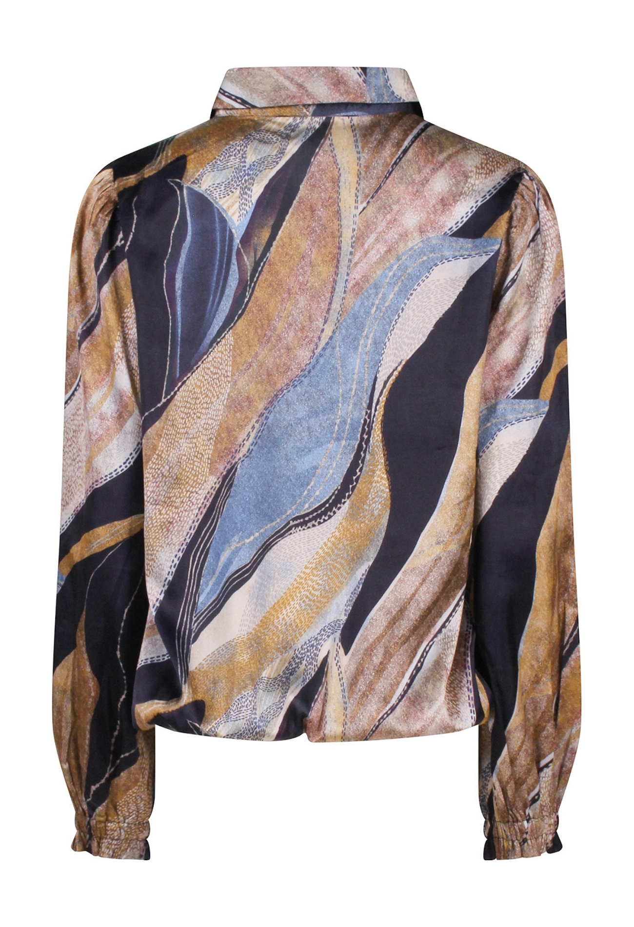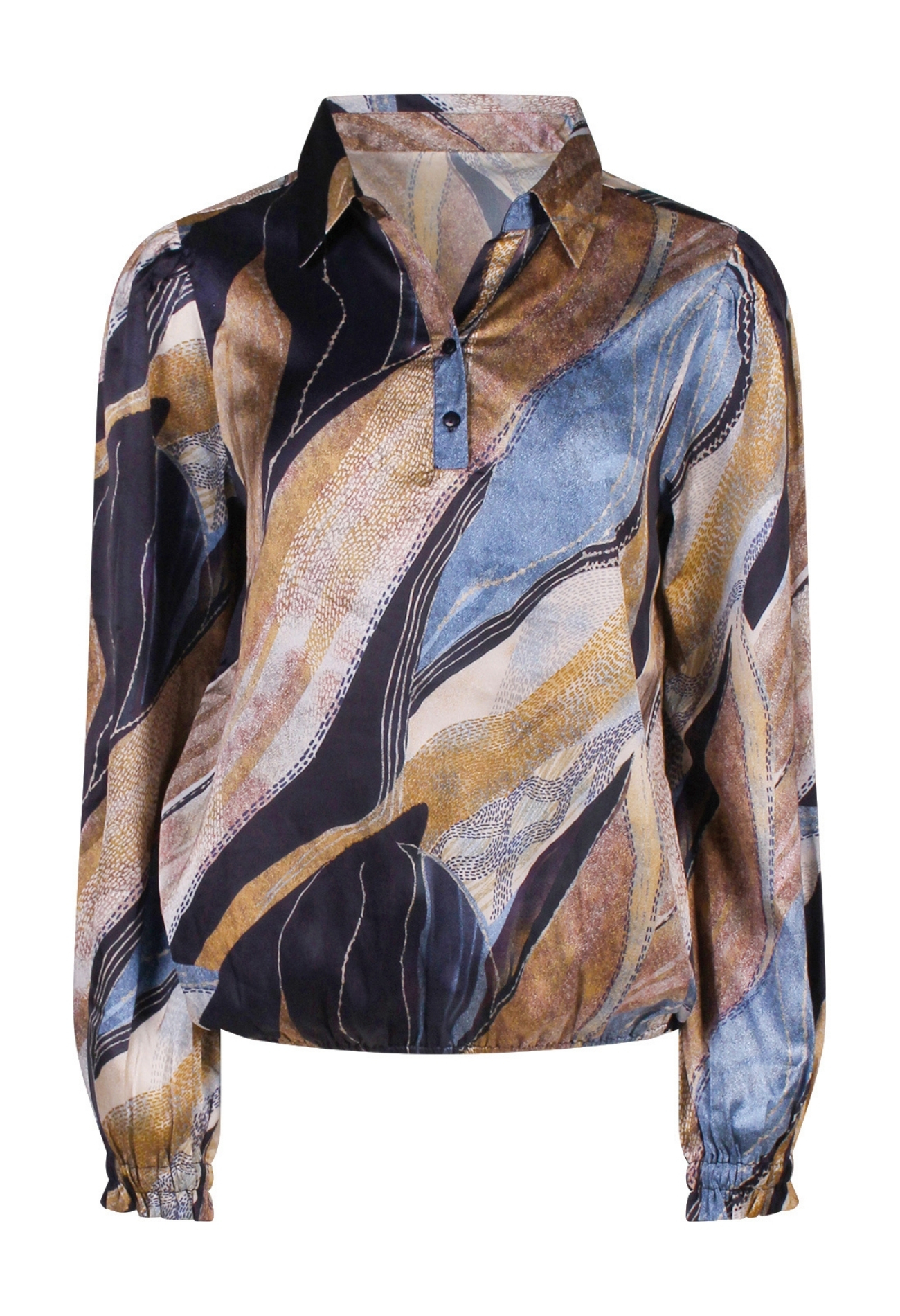 Deze gedessineerde satijnen top is vrouwelijk, soepel en helemaal on-trend! De glanzende stof geeft een luxe uitstraling, terwijl het elastiek aan de onderkant zorgt voor een blousend effect. De mouwen zijn afgewerkt met elastiek, wat een speels ruffledetail creëert. Een stijlvolle keuze voor elke gelegenheid!