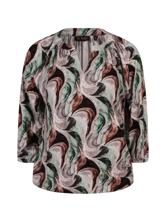 Deze dames top is gemaakt van een comfortabele viscosemix met een speels dessin. Het subtiele mao-kraagje en de 3/4 mouwen geven de top een elegante uitstraling. Dankzij het elastiek aan de onderkant en bij de mouwen krijgt de top een licht blousend effect en een mooie pasvorm. Perfect te combineren met een jeans of rok voor zowel een casual als een meer geklede look.