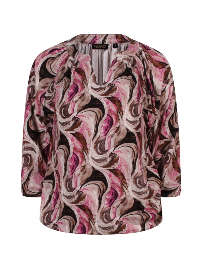 Deze dames top is gemaakt van een comfortabele viscosemix met een speels dessin. Het subtiele mao-kraagje en de 3/4 mouwen geven de top een elegante uitstraling. Dankzij het elastiek aan de onderkant en bij de mouwen krijgt de top een licht blousend effect en een mooie pasvorm. Perfect te combineren met een jeans of rok voor zowel een casual als een meer geklede look.