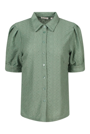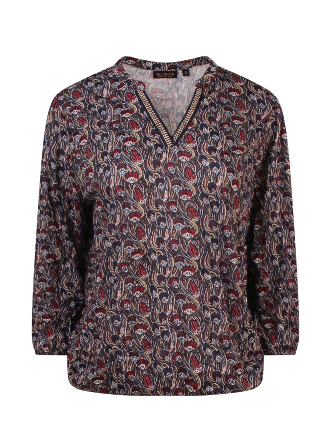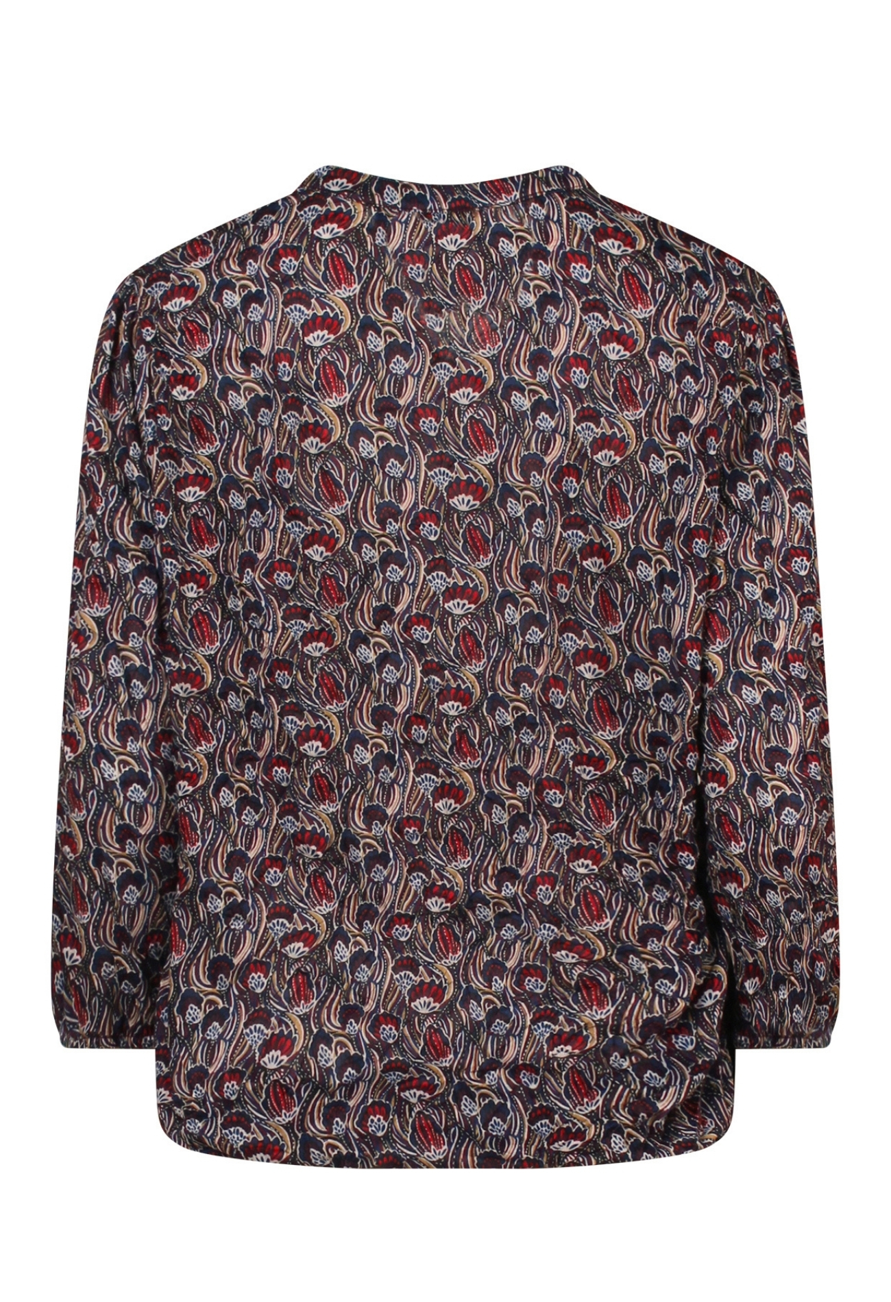 Deze dames top is gemaakt van een lichte pol crush stof en uitgevoerd met een stijlvol dessin. De fancy tape details en de 3/4 mouwen geven de blouse een moderne en elegante uitstraling. Dankzij de soepele stof draagt hij heerlijk comfortabel. Perfect om casual te combineren met een jeans of juist te stylen met een nette broek of rok voor een meer geklede look.