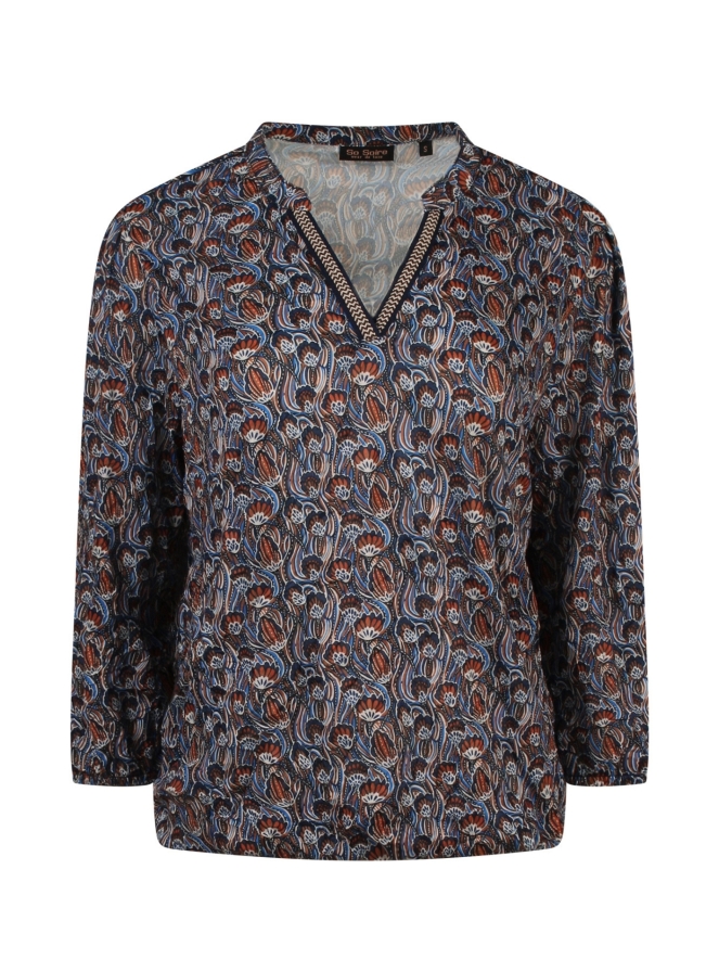 Deze dames top is gemaakt van een lichte pol crush stof en uitgevoerd met een stijlvol dessin. De fancy tape details en de 3/4 mouwen geven de blouse een moderne en elegante uitstraling. Dankzij de soepele stof draagt hij heerlijk comfortabel. Perfect om casual te combineren met een jeans of juist te stylen met een nette broek of rok voor een meer geklede look.