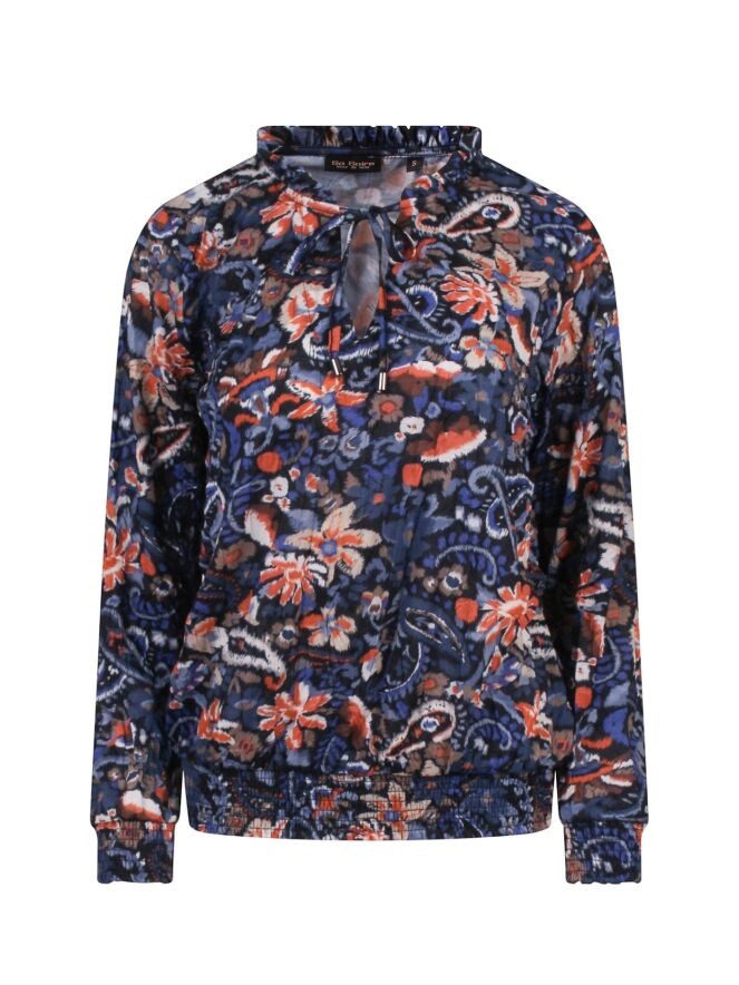 Deze dames top is gemaakt van een luchtige pol crush stof en heeft een prachtig bloem- en paisleydessin dat zorgt voor een speelse en vrouwelijke uitstraling. De ruches en gesmockte details geven de top een elegante en trendy touch. Dankzij de lichte, comfortabele stof is dit item perfect voor een zomerse dag. Combineer de top met een jeans of rok voor een stijlvolle look, of draag hem met de bijpassende broek voor een complete set.