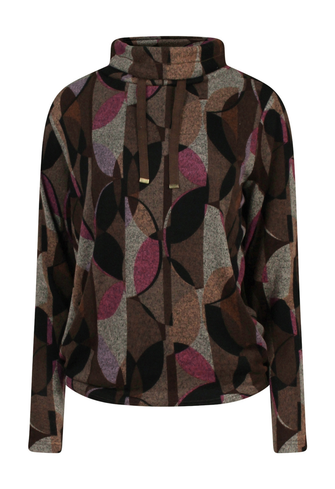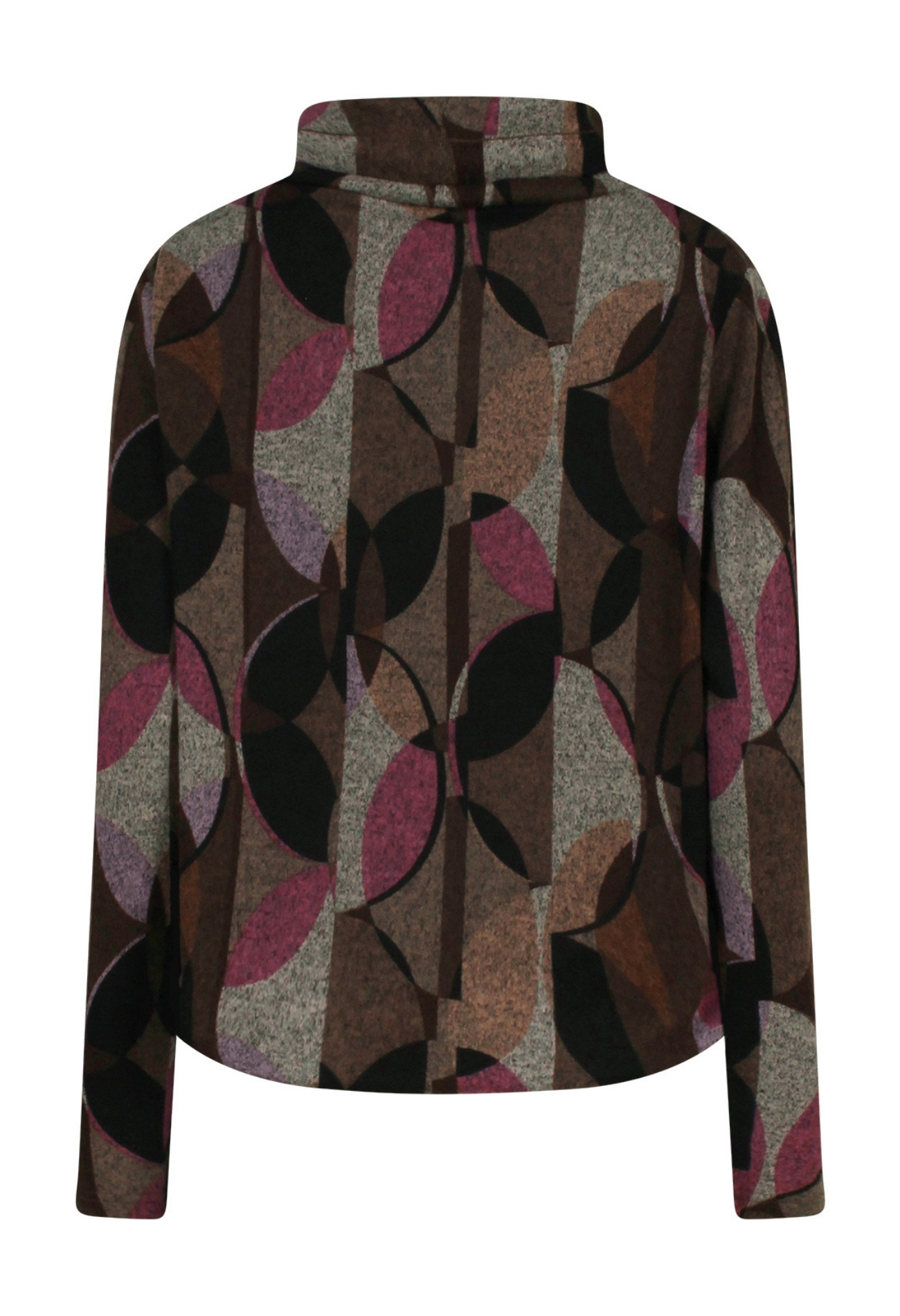 Deze trui is geen dikke maar een dunner exemplaar en heerlijk zacht! Met een fijne col en een mooi cirkel patroon is deze trui net even anders dan je gewend bent! Onder in de taille zit een koordje welke je makkelijk wat strakker kan zetten als je hem wat wilt laten bollen.