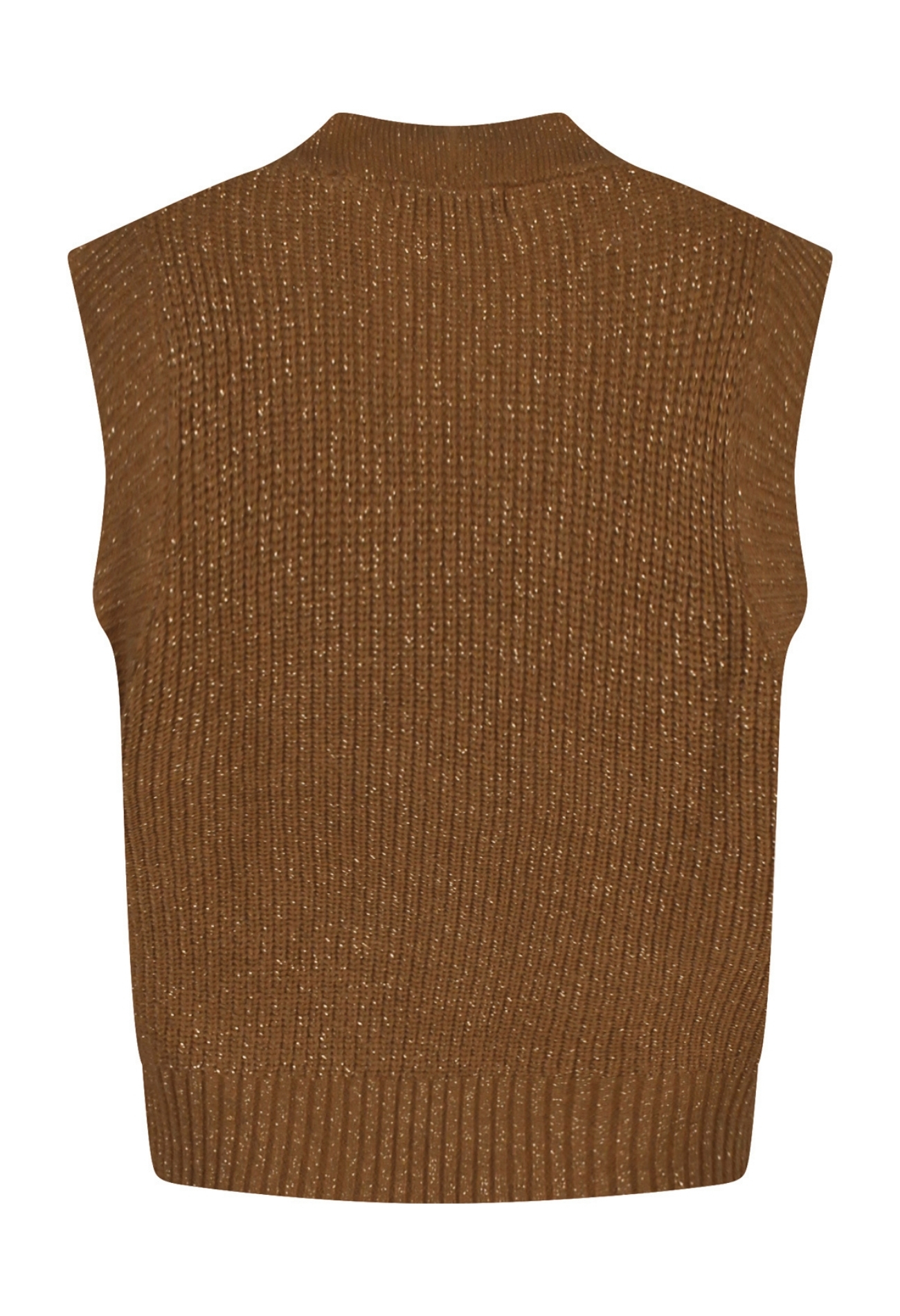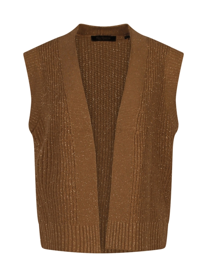Mooi gebreid gilet met een fijne glitterdraad door het garen. Dit giletje draag je eenvoudig over een mooie blouse.