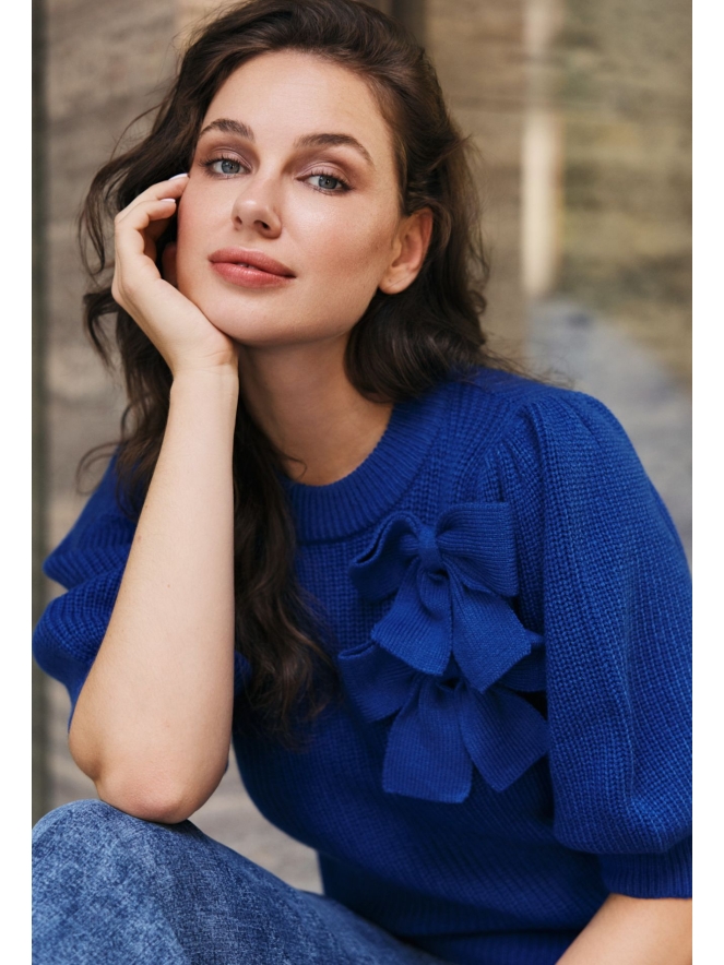 Verrijk je look met deze stijlvolle damestrui met korte mouwen en speelse strikken aan de voorkant. De strikdetails geven een vrouwelijke en verrassende twist aan dit tijdloze item. Dankzij de zachte stof en het comfortabele model is deze trui ideaal voor zowel casual als geklede momenten. Draag ?m op een jeans voor een nonchalante, alledaagse look, of combineer met een leatherlook broek voor een stoere, vrouwelijke outfit met een twist.