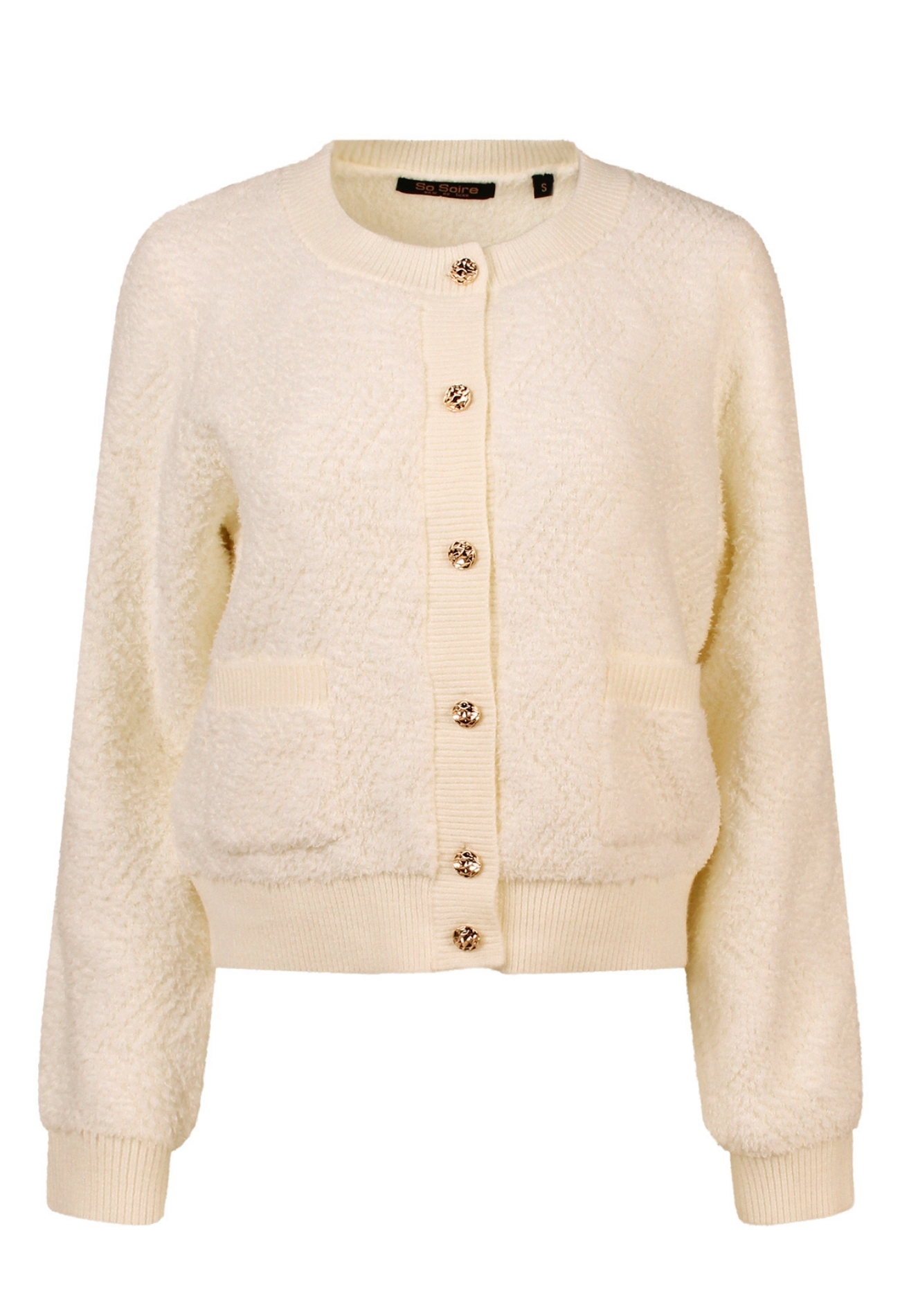 Dit zachte vest heeft een teddy look. Sluit met sierlijke goudkleurige knopen en heeft twee zakjes voorop. Heerlijk vestje om te dragen op je favoriete spijkerbroek of jurk of rok!