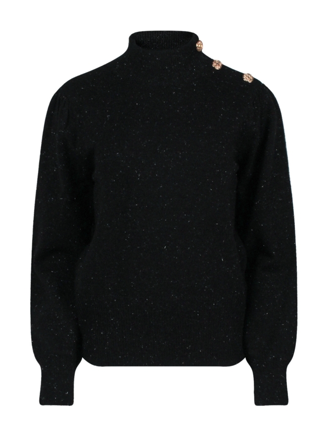 Prachtige trui met een opstaande kraag met sierlijke knopen. Door het breisel van deze trui zit een glitterdraad geweven. Heerlijk tijdens kouder weer en misstaat ook zeker niet tijdens de feestdagen!