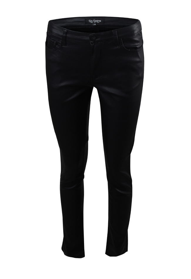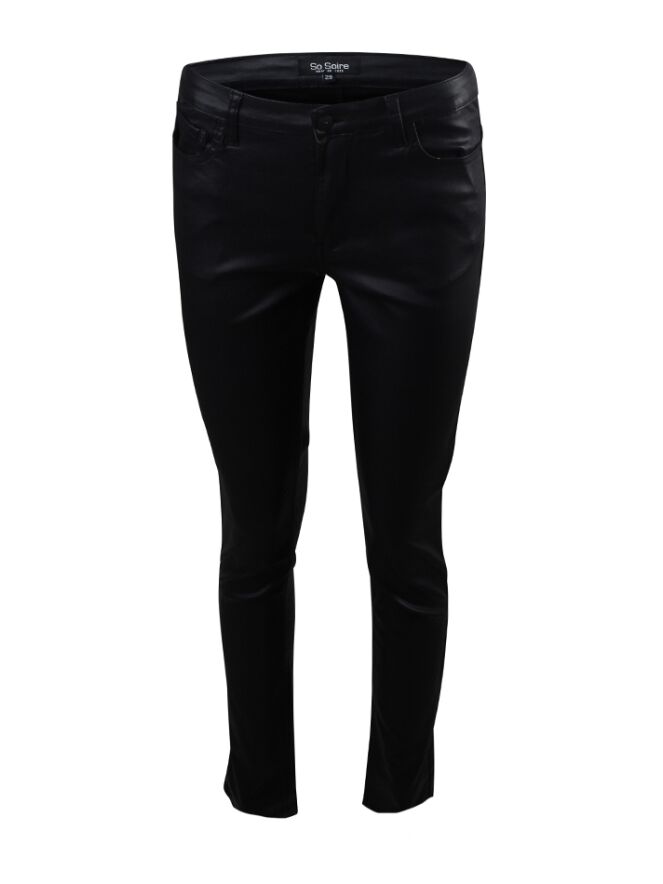 PU coated broek van So Soire. De broek heeft een coated look en feel, de broek heeft een recht model en super stretch fit met push up. De lengte van de broek is 31 inch. Materiaal: 77% rayon, 20% nylon, 3% elasthan. 30 graden wassen, niet bleken, niet in de droger, niet chemisch reinigen, niet strijken.