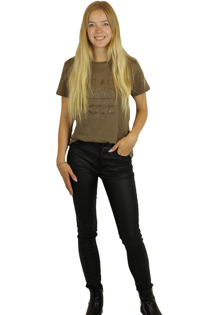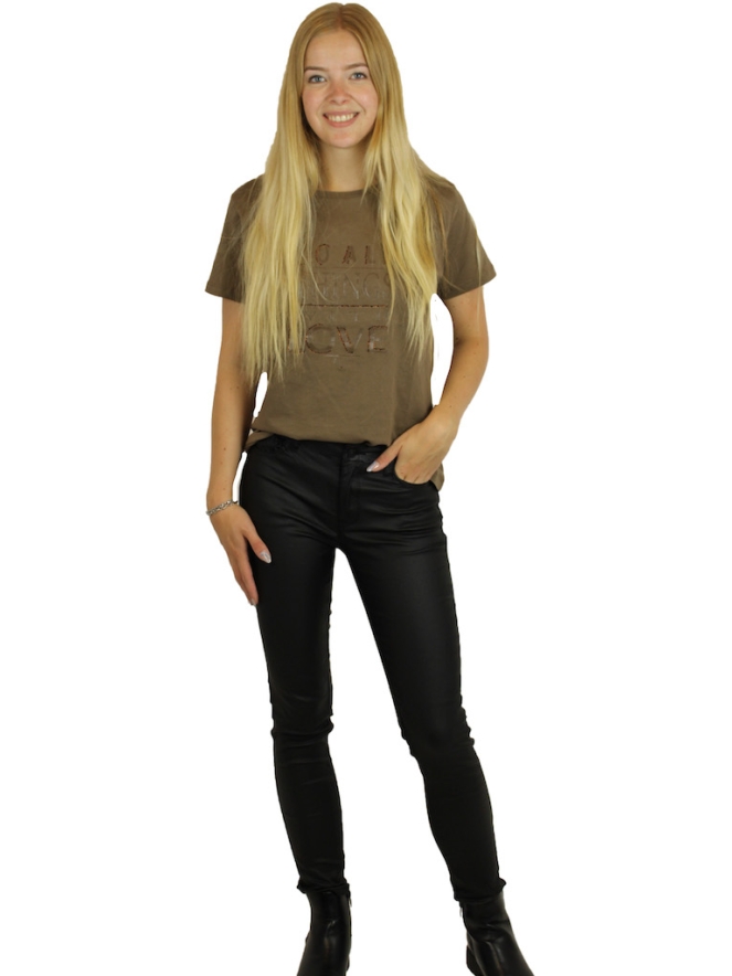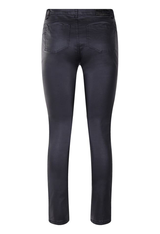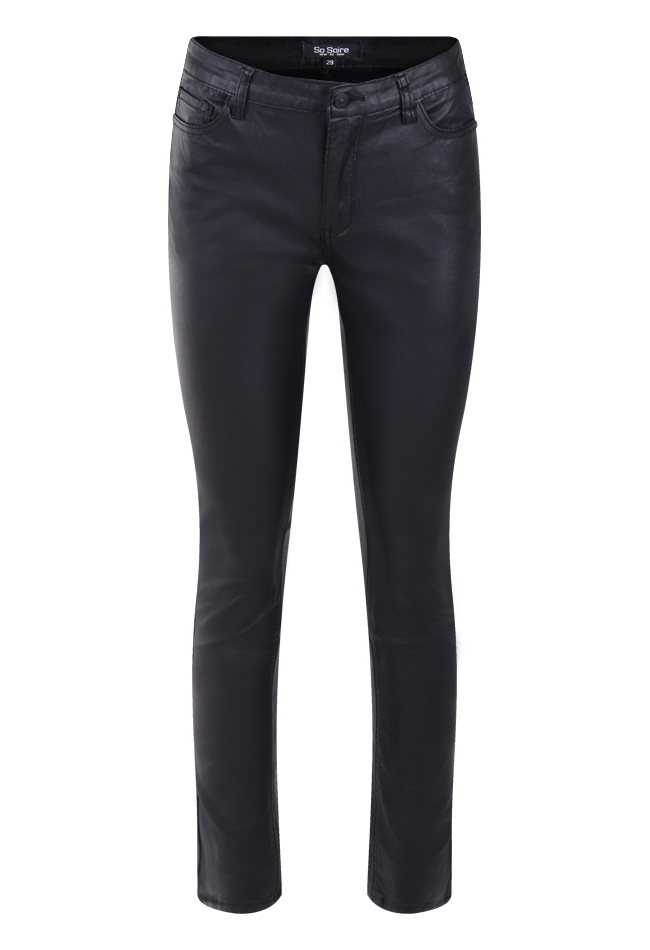 Coated broek van So Soire. De broek heeft een coated look en heeft een skinny model met push up effect. Valt op maat. Materiaal: 77% rayon, 20% nylon, 3% elasthan. Wassen op 30 graden, niet bleken, niet in de droger, kan gestreken worden.