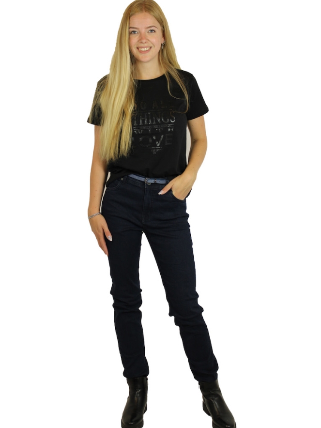 Jeans van So Soire. De jeans hebben een hoge taille, er zit een riempje bij. De lengte is 32inch. Materiaal: 75% katoen, 21% polyester, 2% rayon, 2% elasthan. Wassen op 30 graden, niet bleken, niet in de droger, niet strijken.