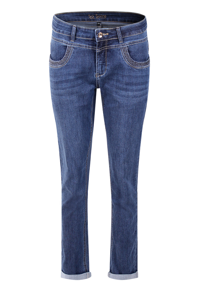 Jeans van So Soire. De jeans hebben een gewone wash en details op de zakken. Mid waist en vallen op maat. Materiaal: 68% katoen, 29% polyester, 3% elasthan. Wassen op 30 graden, niet bleken, niet in de droger, kan gestreken worden.