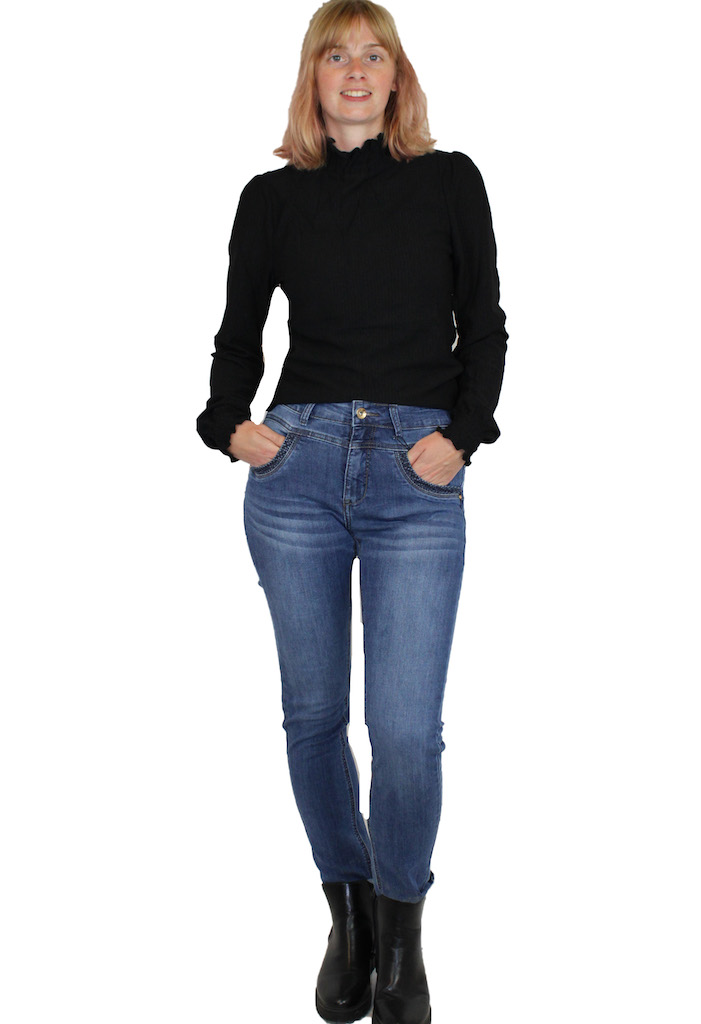 Jeans van So Soire. De jeans hebben een gewone wash en details op de zakken. Mid waist en vallen op maat. Materiaal: 68% katoen, 29% polyester, 3% elasthan. Wassen op 30 graden, niet bleken, niet in de droger, kan gestreken worden.