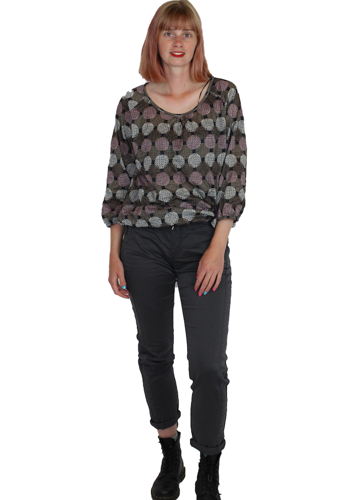 T-shirt met lange mouw van So Soire. Het t-shirt heeft een gekreukt effect en een all over print. Er zit elastiek in de onderkant van het t-shirt. Valt groot, model draagt maat S. Materiaal: 100% polyester. Wassen op 30 graden, niet bleken, niet in de droger, niet strijken.