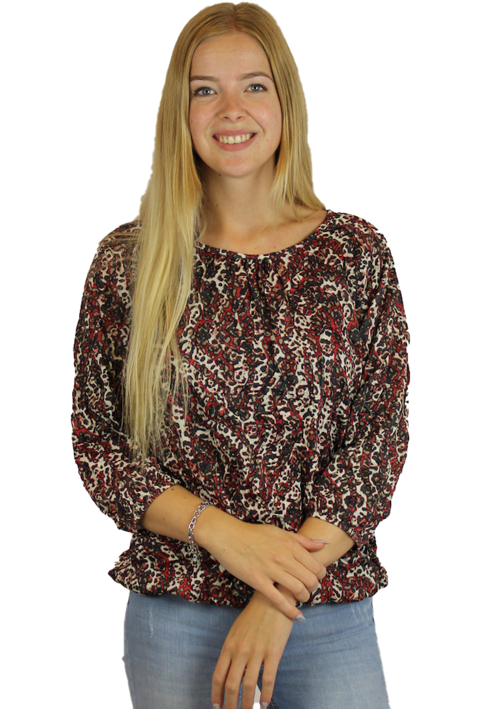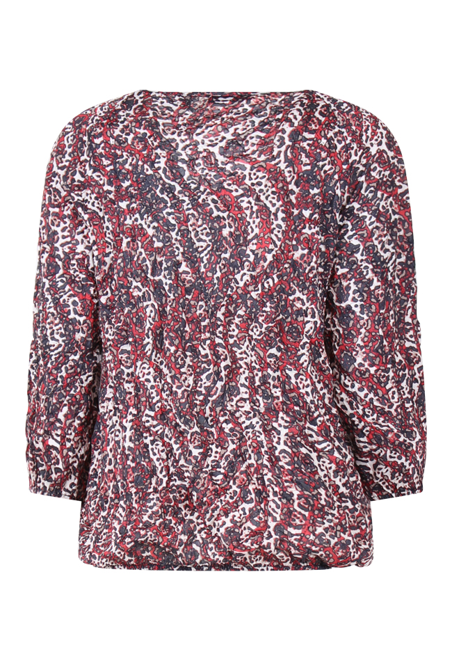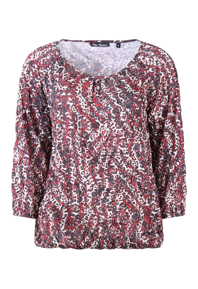 Crushed t-shirt van So Soire. Het t-shirt heeft een gekreukeld effect en een all over print. Er zit elastiek in de onderkant. Valt oversized. Materiaal: 100% polyester. Wassen op 30 graden, niet bleken, niet in de droger, kan gestreken worden.