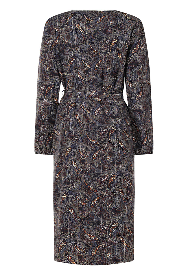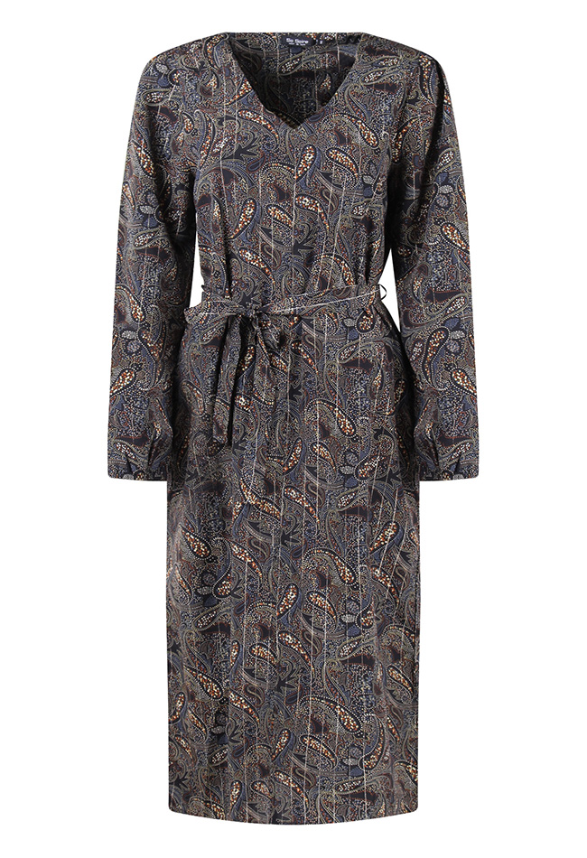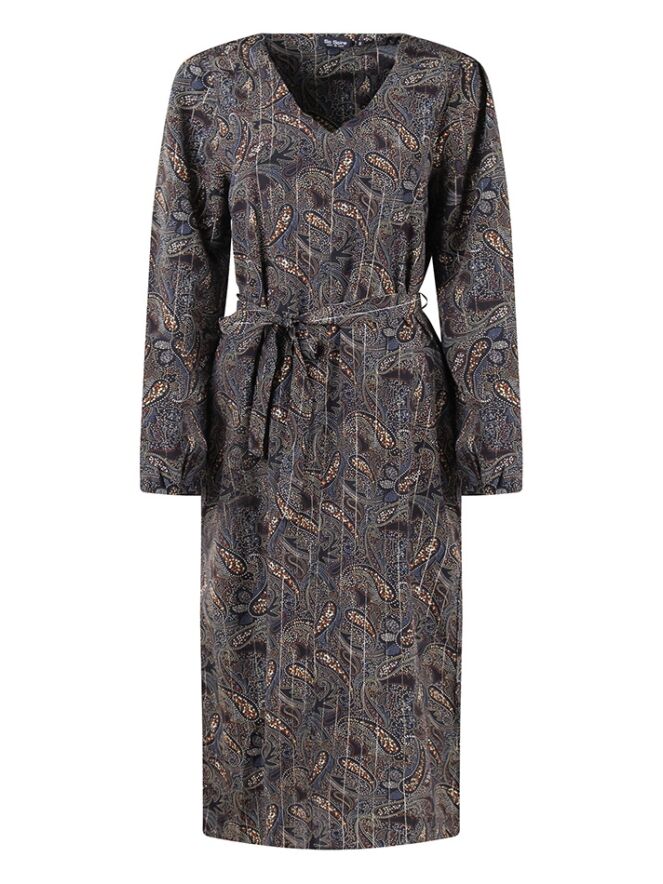 Blouse jurk van So Soire. De jurk heeft een lang model en een all over glitter paisley print. De jurk heeft een strik riem. Materiaal: 100% polyester. Wassen op 30 graden, niet bleken, niet in de droger, kan gestreken worden.