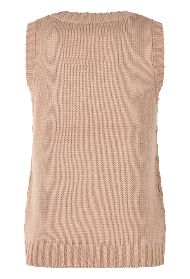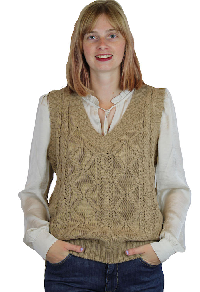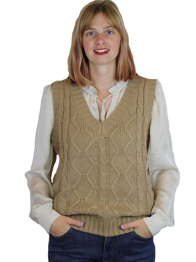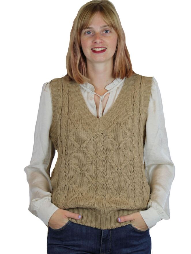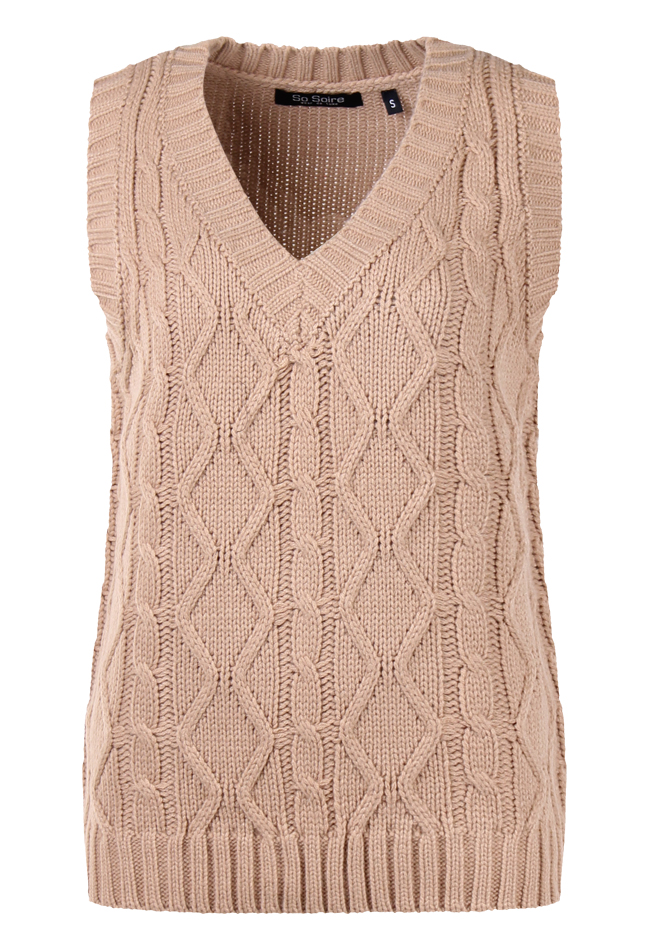 Spencer van So Soire. De spencer heeft een kabel brei en valt ruim. Materiaal: 100% acrylic. Wassen op 30 graden, niet bleken, niet in de droger, niet strijken.