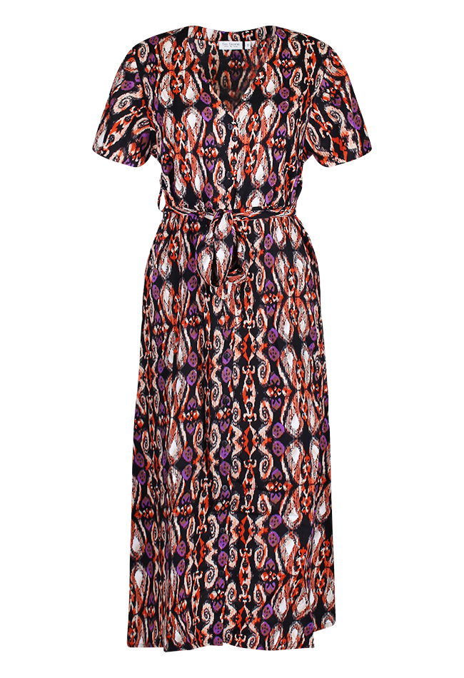 Jurk van So Soire. Deze middellange jurk heeft een V-hals en vlindermouwen. In de middel zit een strikceintuur en de jurk word gesloten door middel van knopen die van boven tot onder lopen.