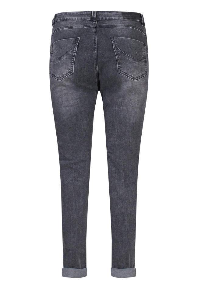 Comfortabele grijze licht gewassen 5-pocket jeans met superstretch, waardoor deze erg comfortabel zit. Aan de voorzijde heeft de jeans steekzakken met een money pocket versierd met kleine glinsterende steentjes. Aan de achterzijde zijn er opgestikte zakken, ook voorzien van kleine glinsterende steentjes.