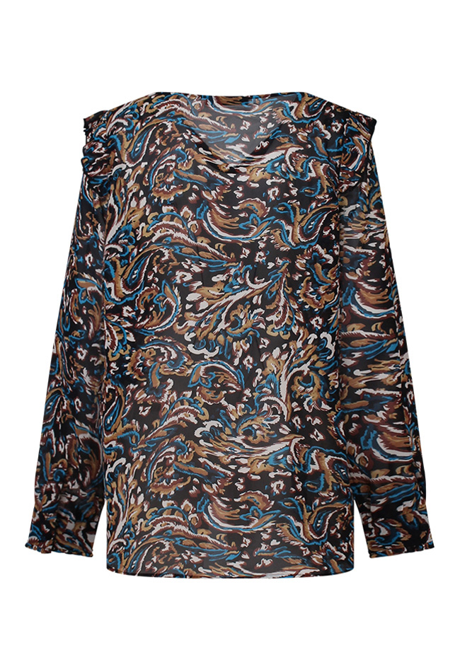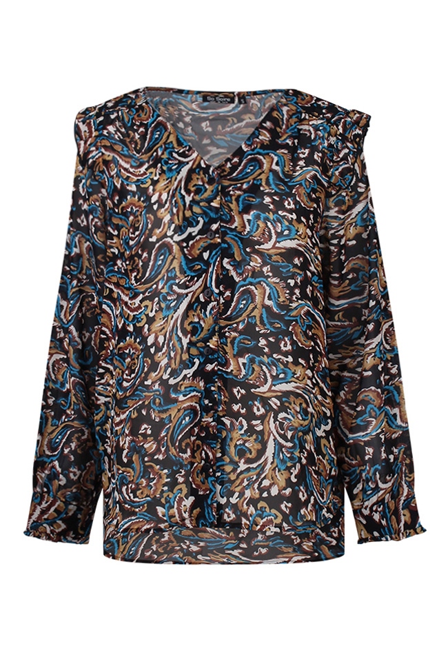 Blouse met V-hals en knoopsluiting voor. Deze blouse heeft rusches op de schouder en op de mouw met een allover paisley design. Aan de achterkant is de blouse langer dan aan de voorkant.