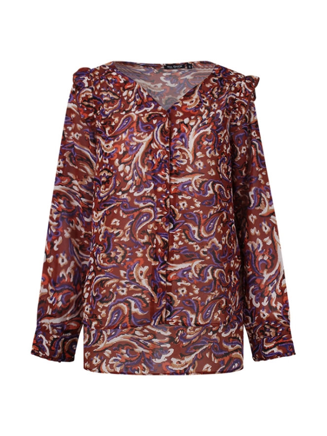 Blouse met V-hals en knoopsluiting voor. Deze blouse heeft rusches op de schouder en op de mouw met een allover paisley design. Aan de achterkant is de blouse langer dan aan de voorkant.