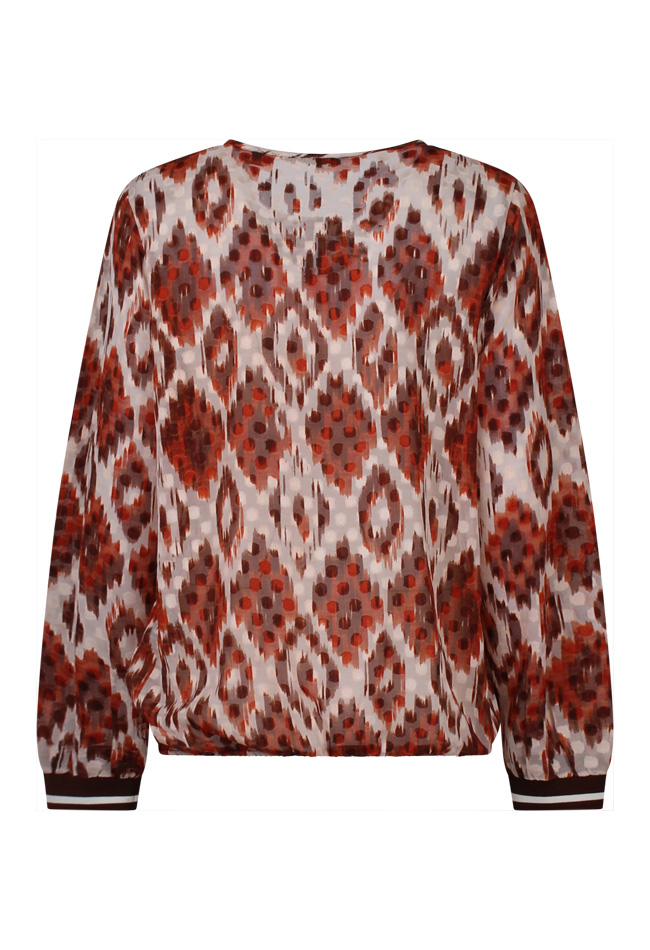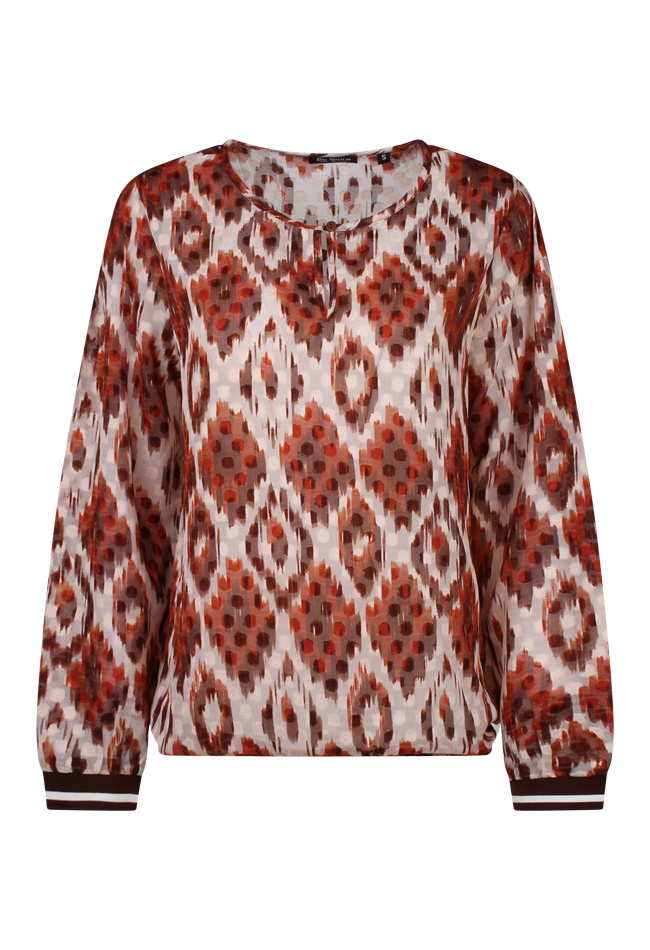 Deze top met lange mouwen heeft een ronde hals en een splitje aan de voorzijde dat sluit met een knoopje voor een stijlvol detail. De top is voorzien van een trendy all-over Ikat print. De onderzijde heeft elastiek, wat zorgt voor een comfortabele pasvorm en een licht geplooide look. De boord is elastisch en heeft twee kleuren.