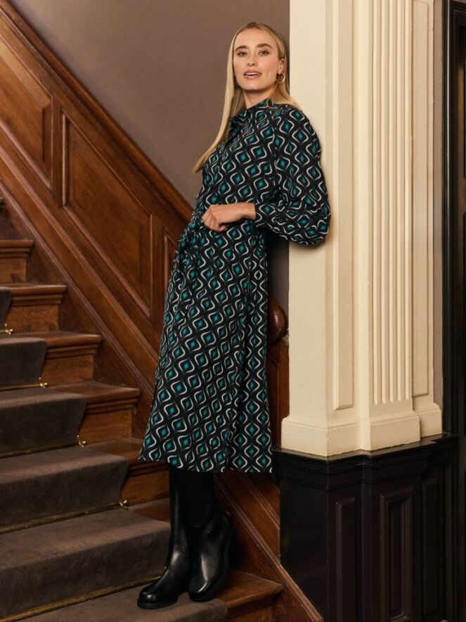 Lange blouse jurk met knopen met een retro dessign. Deze jurk heeft pofmouwen.