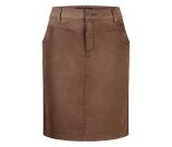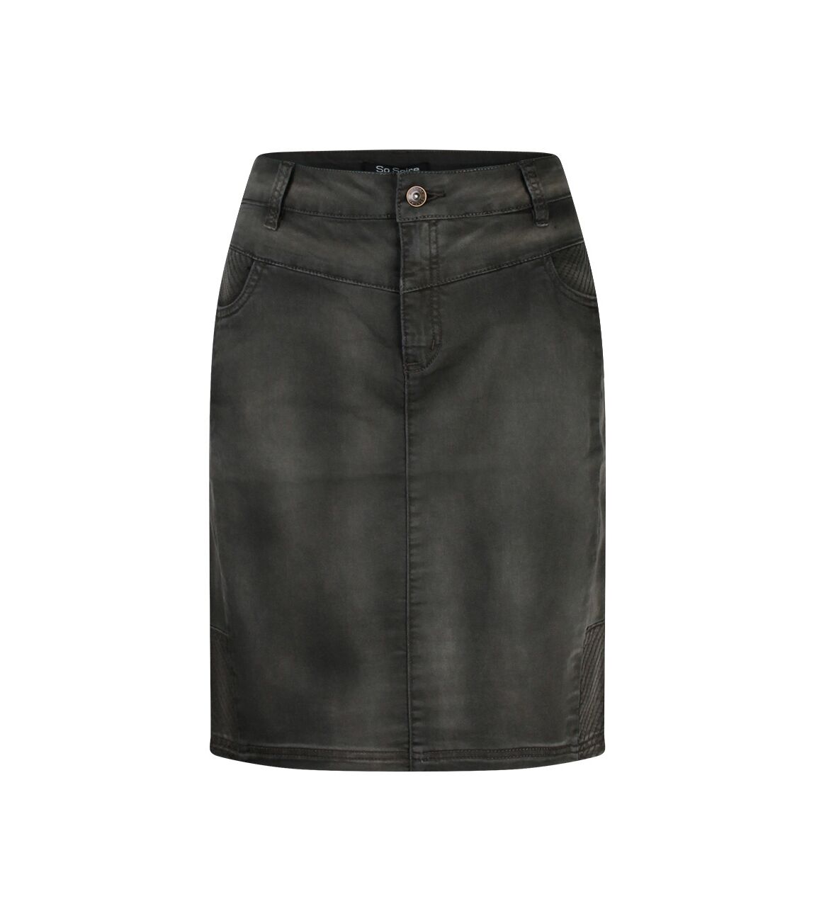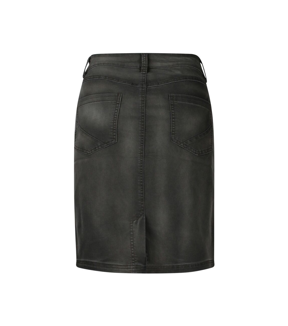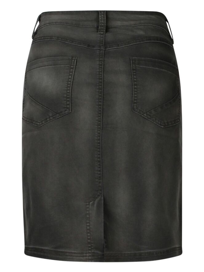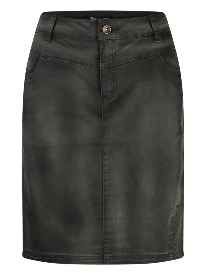 Een kokerrok gemaakt van stretch denim materiaal, met kenmerkende deelnaden en doorgestikte details. Aan de achterkant bevinden zich kontzakken, terwijl de voorkant is voorzien van jeanszakken. De rok heeft een subtiel splitje aan de achterzijde en wordt gesloten met een rits en een knoop. De tailleband is voorzien van riemlussen.