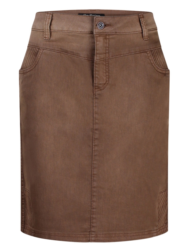 Een kokerrok gemaakt van stretch denim materiaal, met kenmerkende deelnaden en doorgestikte details. Aan de achterkant bevinden zich kontzakken, terwijl de voorkant is voorzien van jeanszakken. De rok heeft een subtiel splitje aan de achterzijde en wordt gesloten met een rits en een knoop. De tailleband is voorzien van riemlussen.