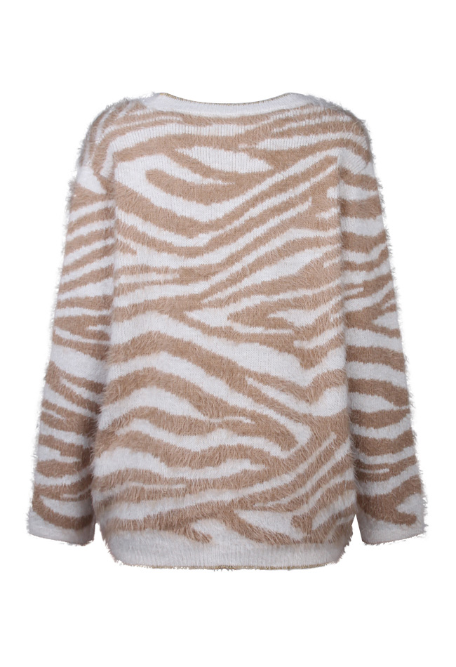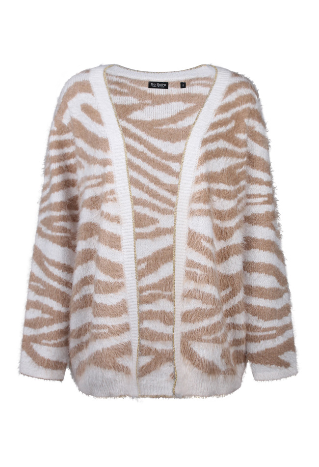 Dit overslag vest is gemaakt met featheryarn en heeft daarom een pluizige zachte uitstraling. Het vest heeft een allover zebraprint en is aan de voorzijde afgebiesd met gouddraad.