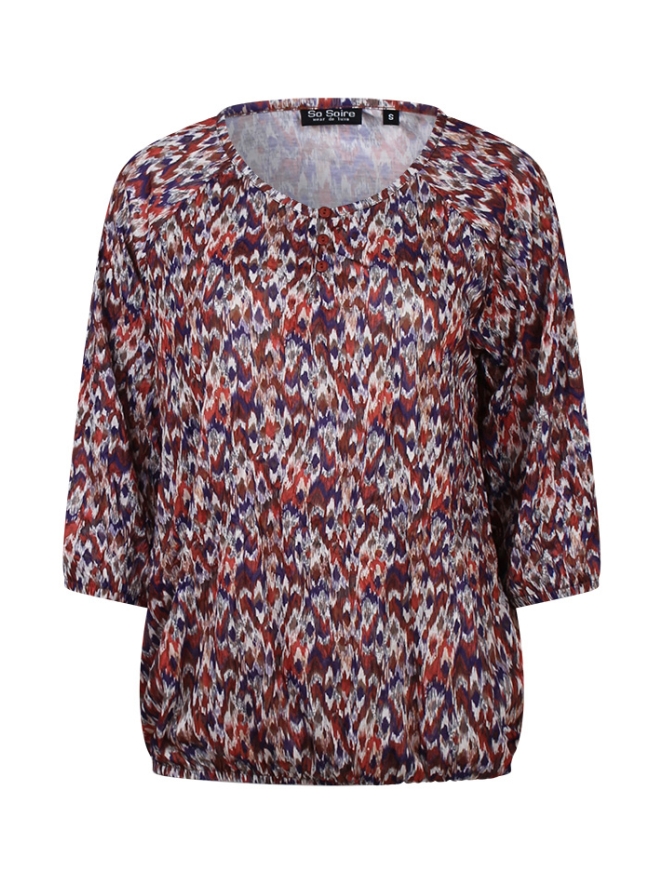 Stijlvol shirt met driekwart mouwen, all-over print en een ronde hals met splitje aan de voorzijde, gesloten met drie knoopjes. De mouwuiteinden en de onderzijde van het shirt zijn voorzien van elastiek voor een comfortabele en trendy pasvorm.