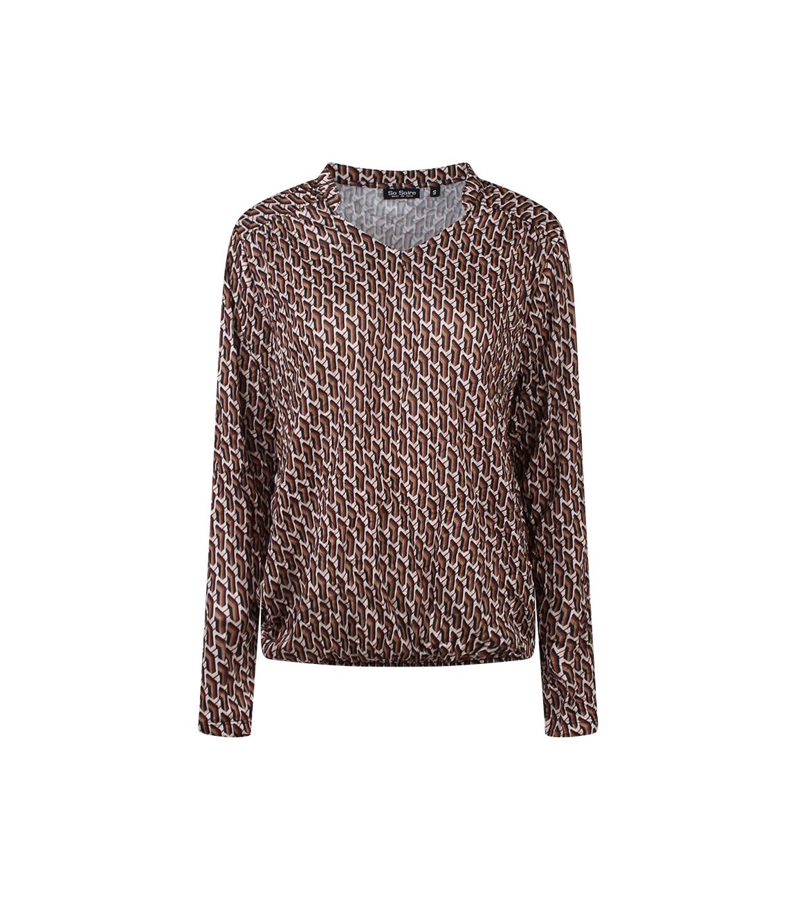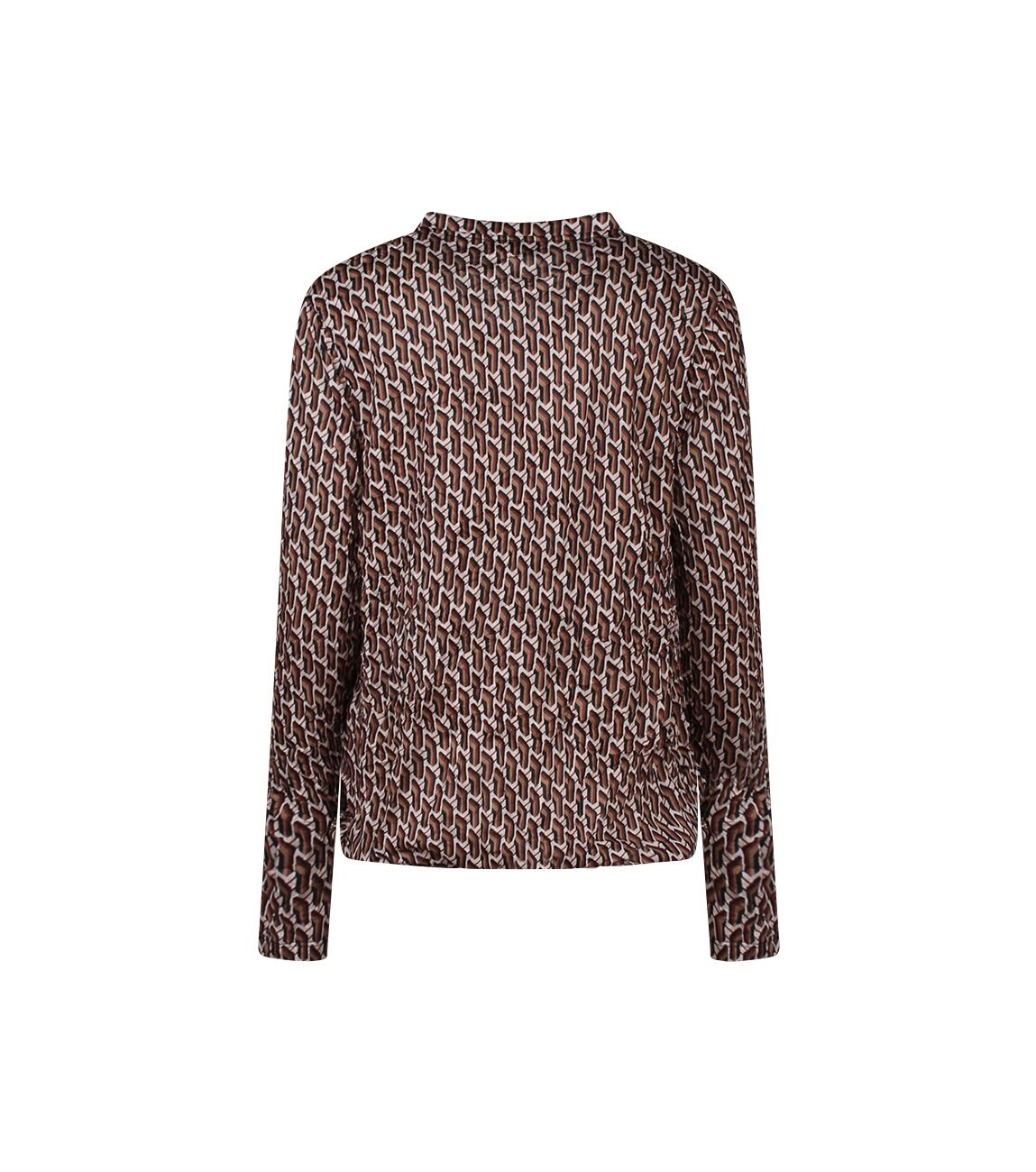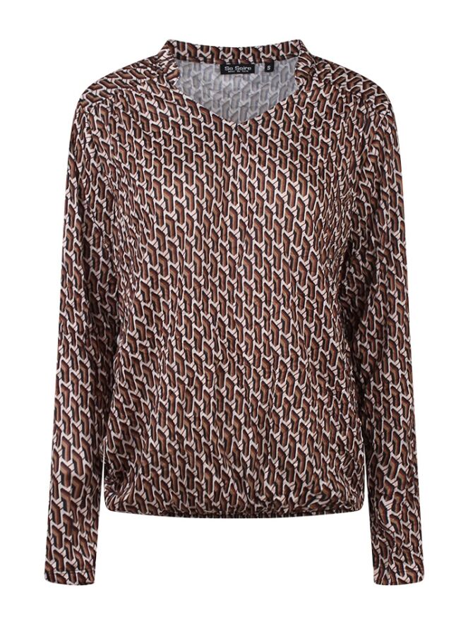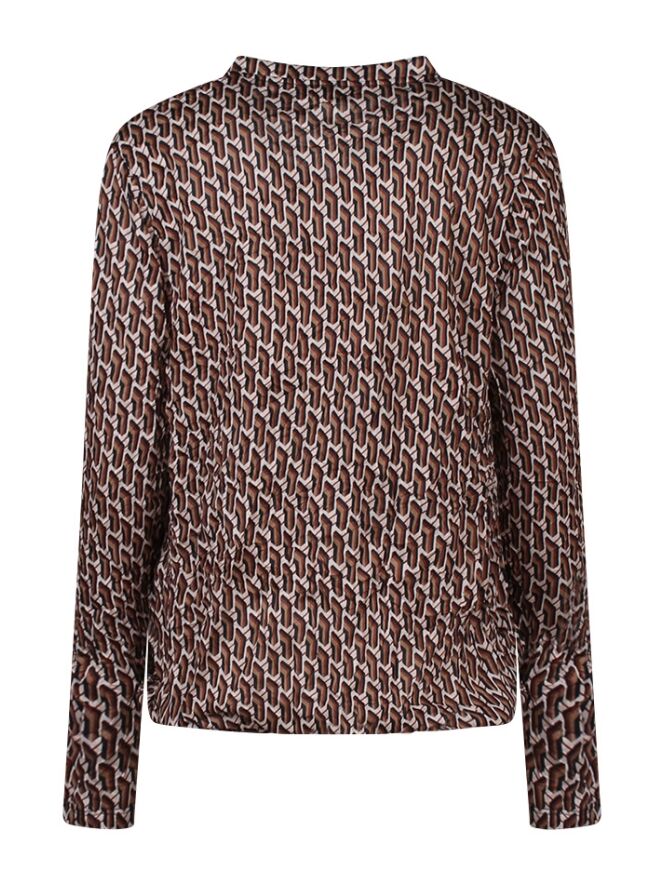 Top met lange mouwen en een V-hals. Deze top is ontworpen met aandacht voor detail en comfort. Het bijzondere aan deze top is het grafische design, wat een eigentijdse en stijlvolle uitstraling geeft. In de boord zit een elastiek. Om het kreukel effect in de top te behouden, adviseren we om de top na het wassen voorzichtig op te rollen en vast te knopen.