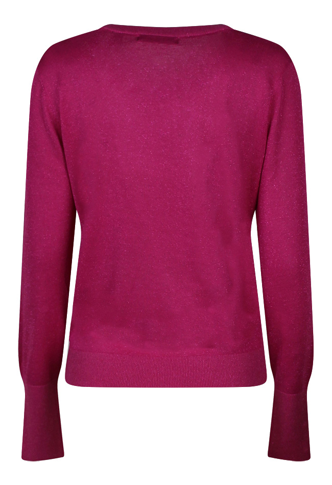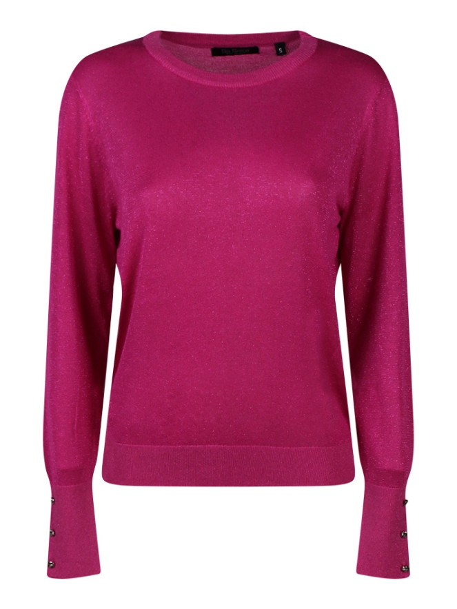 Fijn gebreide trui met glimmend lurexdraad. Deze elegante trui heeft een ronde hals en stijlvolle hoge manchetten met sier knoopjes aan de mouwen.